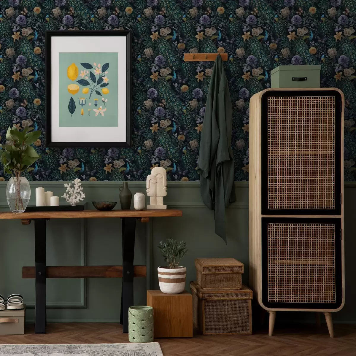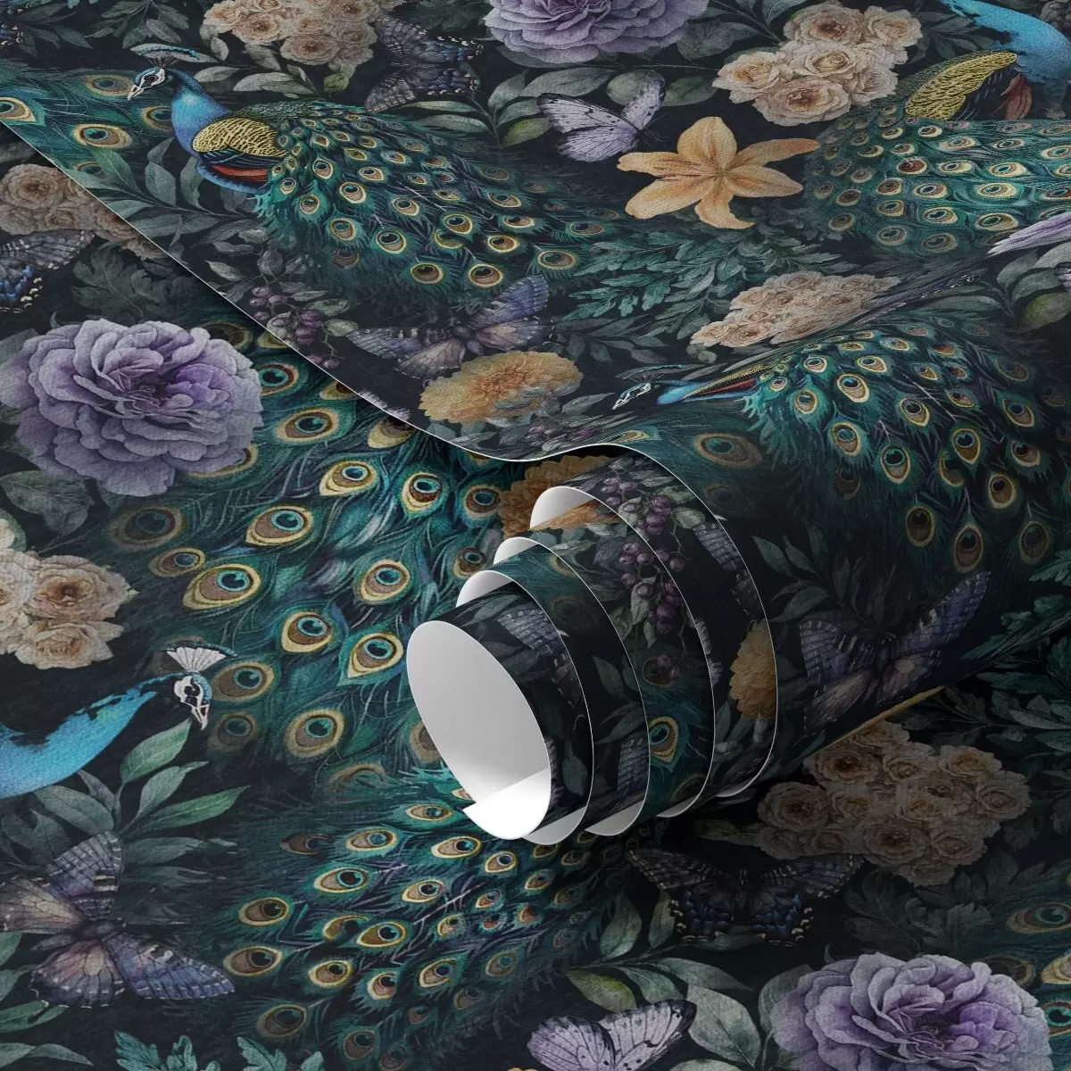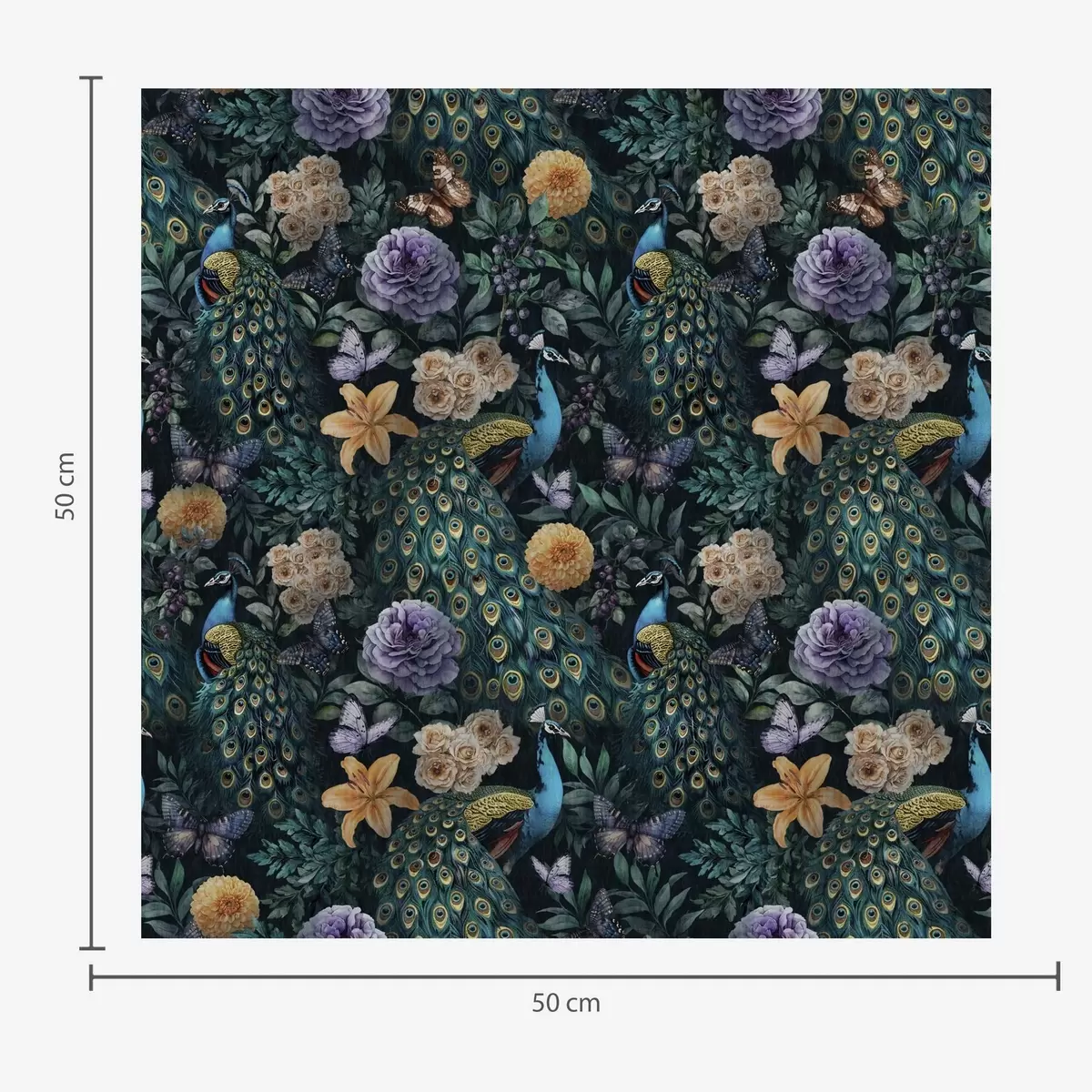 Tapet Păuni printre flori întunecate și fluturi Nr. a00348