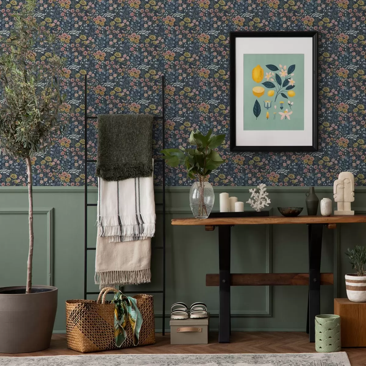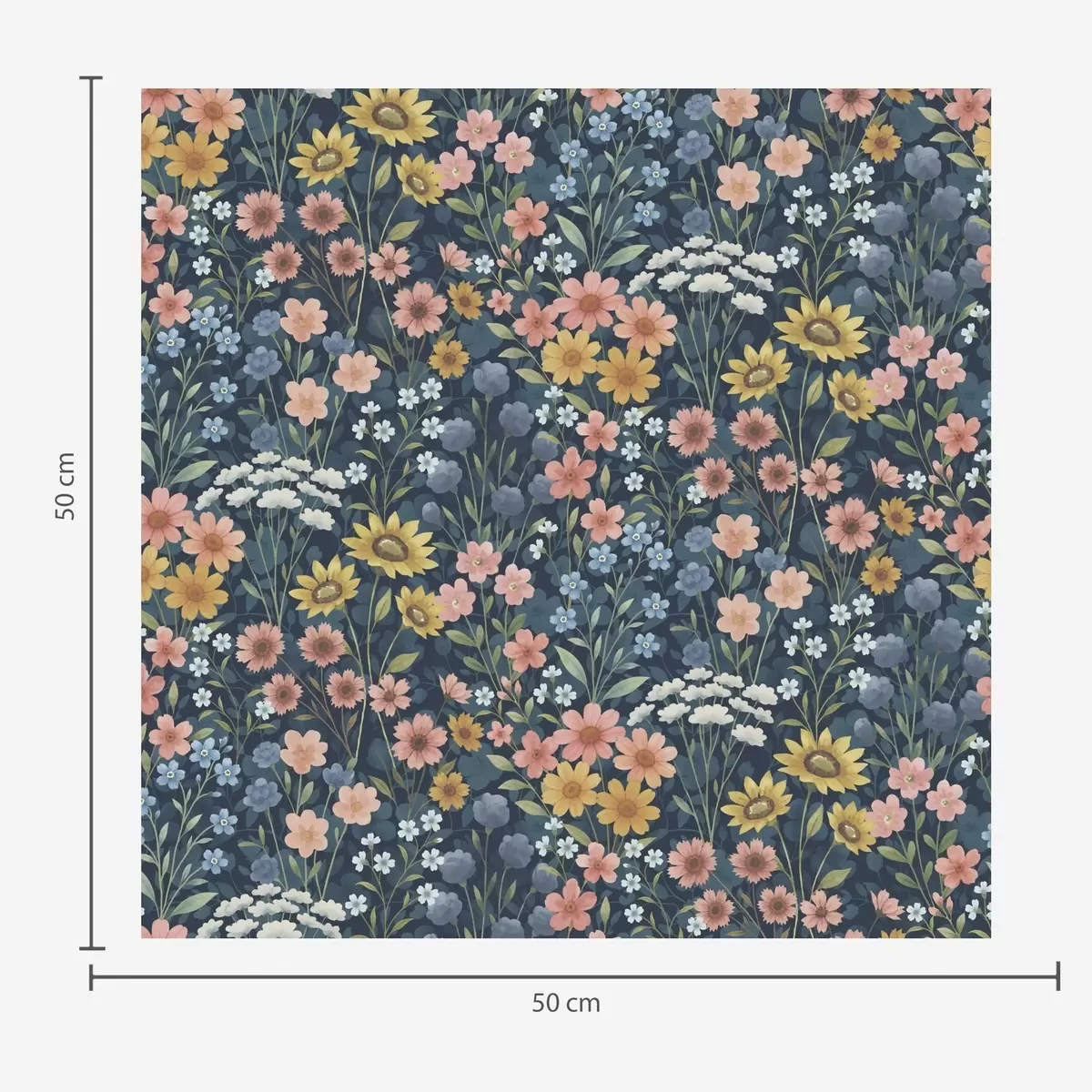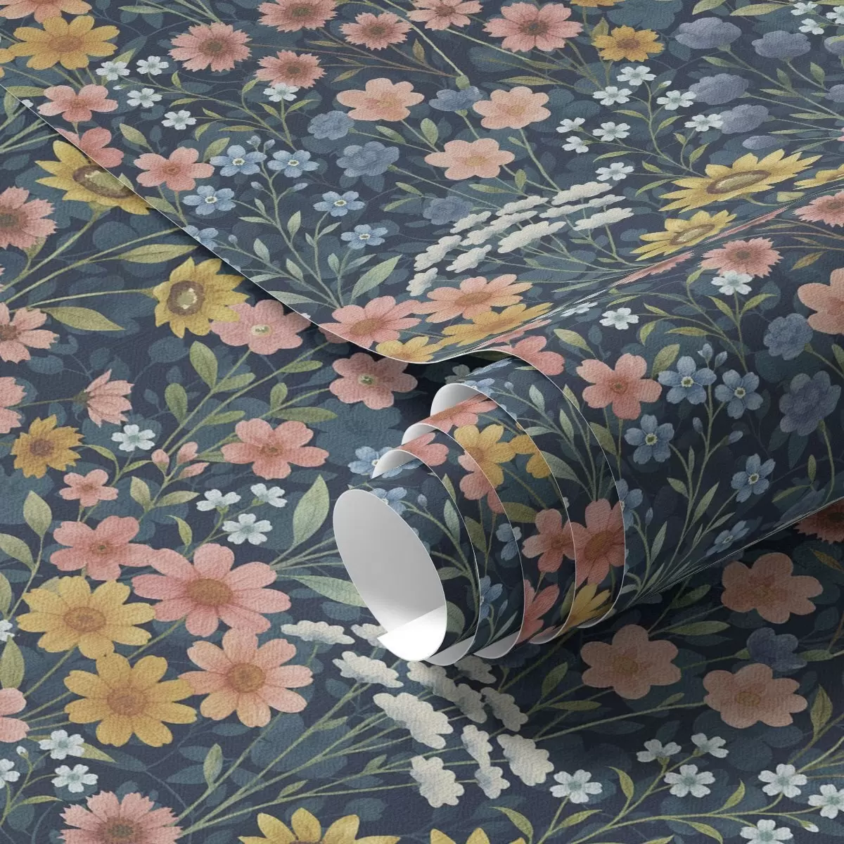 Wallpaper Colorat acuarelă flori de pajiște pe albastru marin a00381