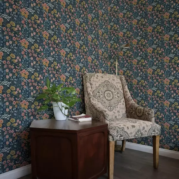 Wallpaper Colorat acuarelă flori de pajiște pe albastru marin a00381