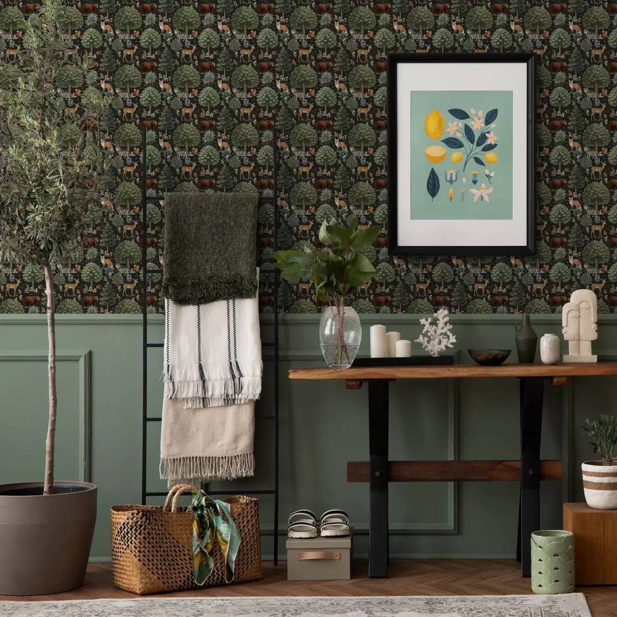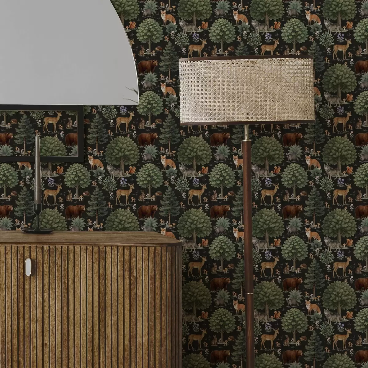 Tapet Acuarelă animale de pădure cu copaci și ciuperci Nr. a00391