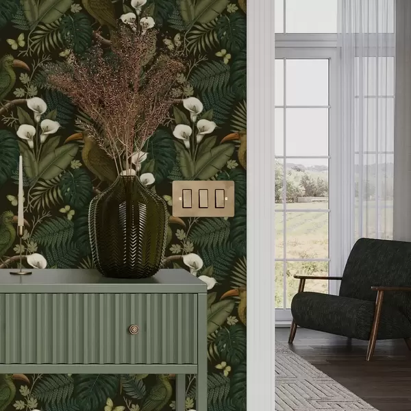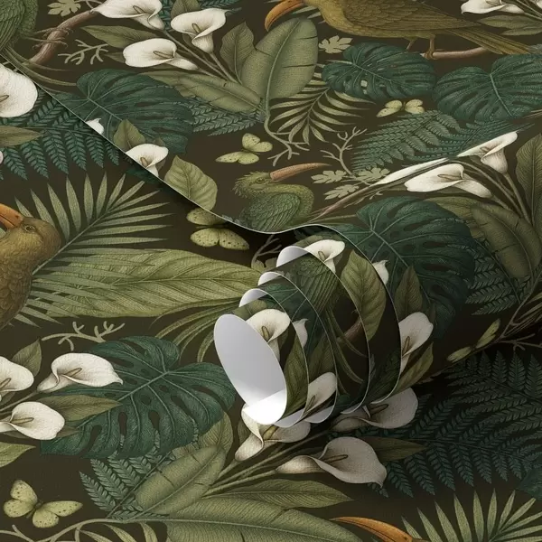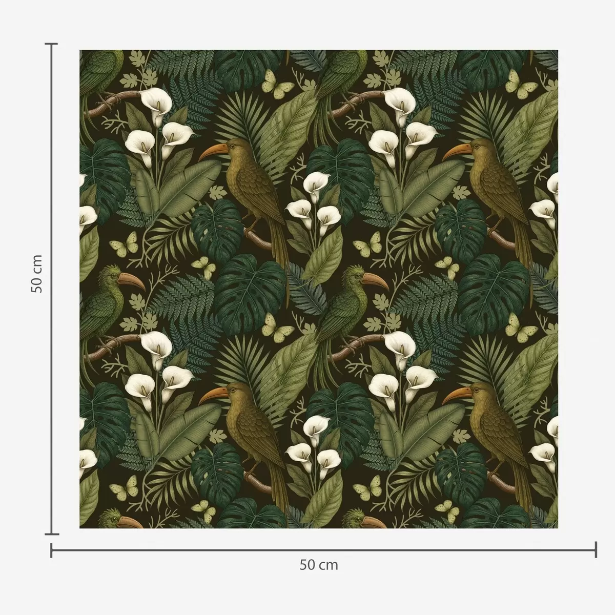 Tapet Păsări tropicale și verdeață luxuriantă pe fundal întunecat de junglă Nr. a00397