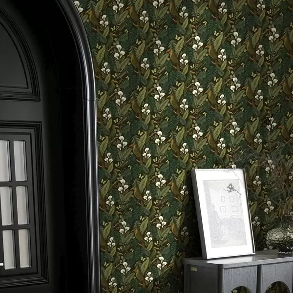 Tapet Păsări tropicale și verdeață luxuriantă pe fundal întunecat de junglă Nr. a00397