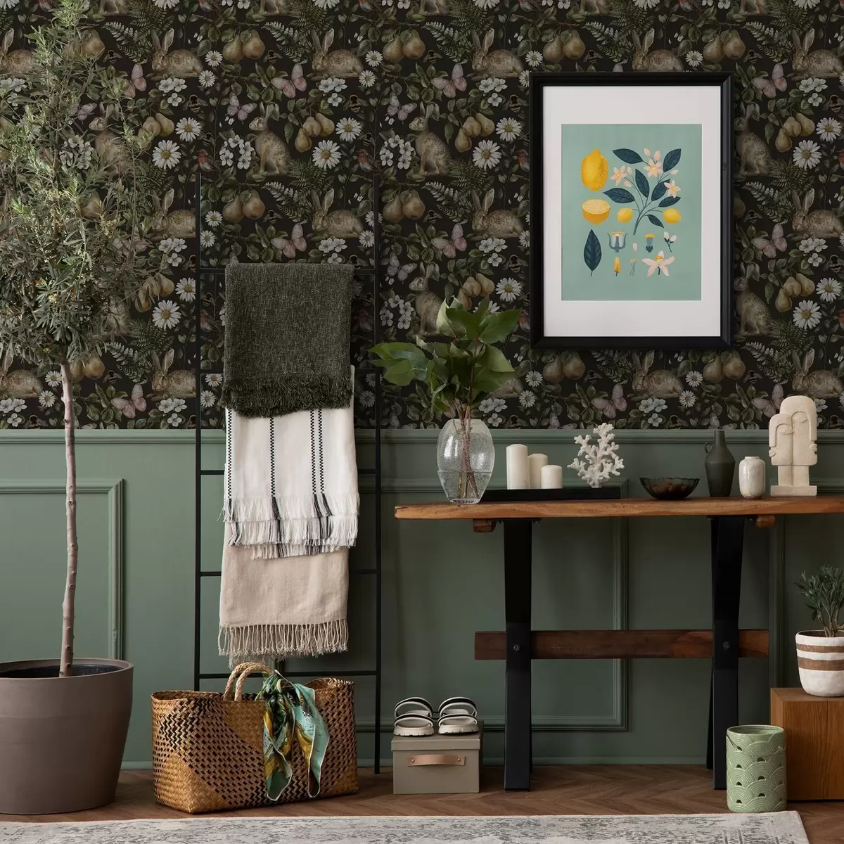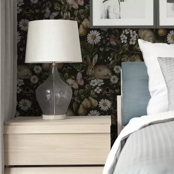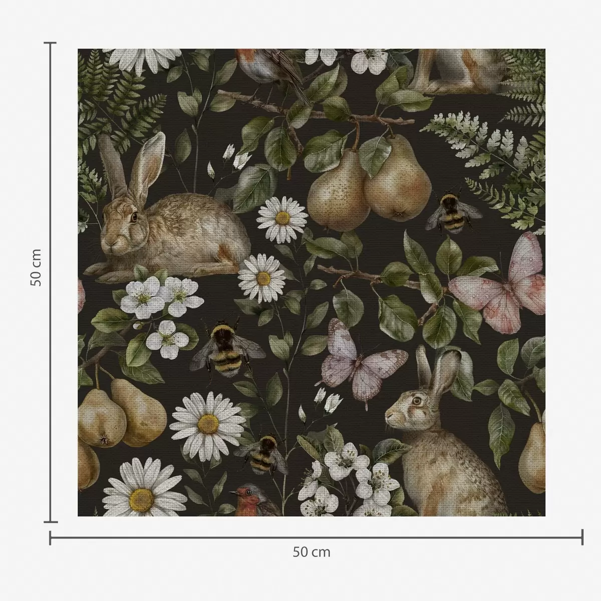 Tapet Iepuri realiști, pere, flori și insecte pe un fundal întunecat Nr. a00401