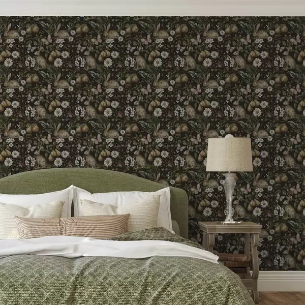 Tapet Iepuri realiști, pere, flori și insecte pe un fundal întunecat Nr. a00401
