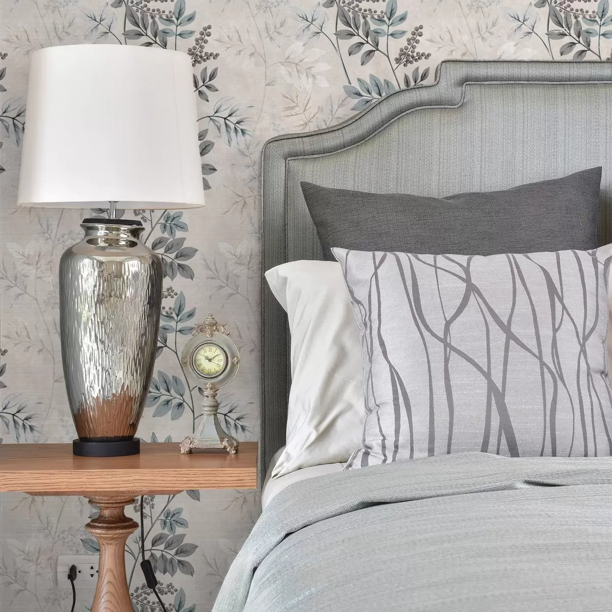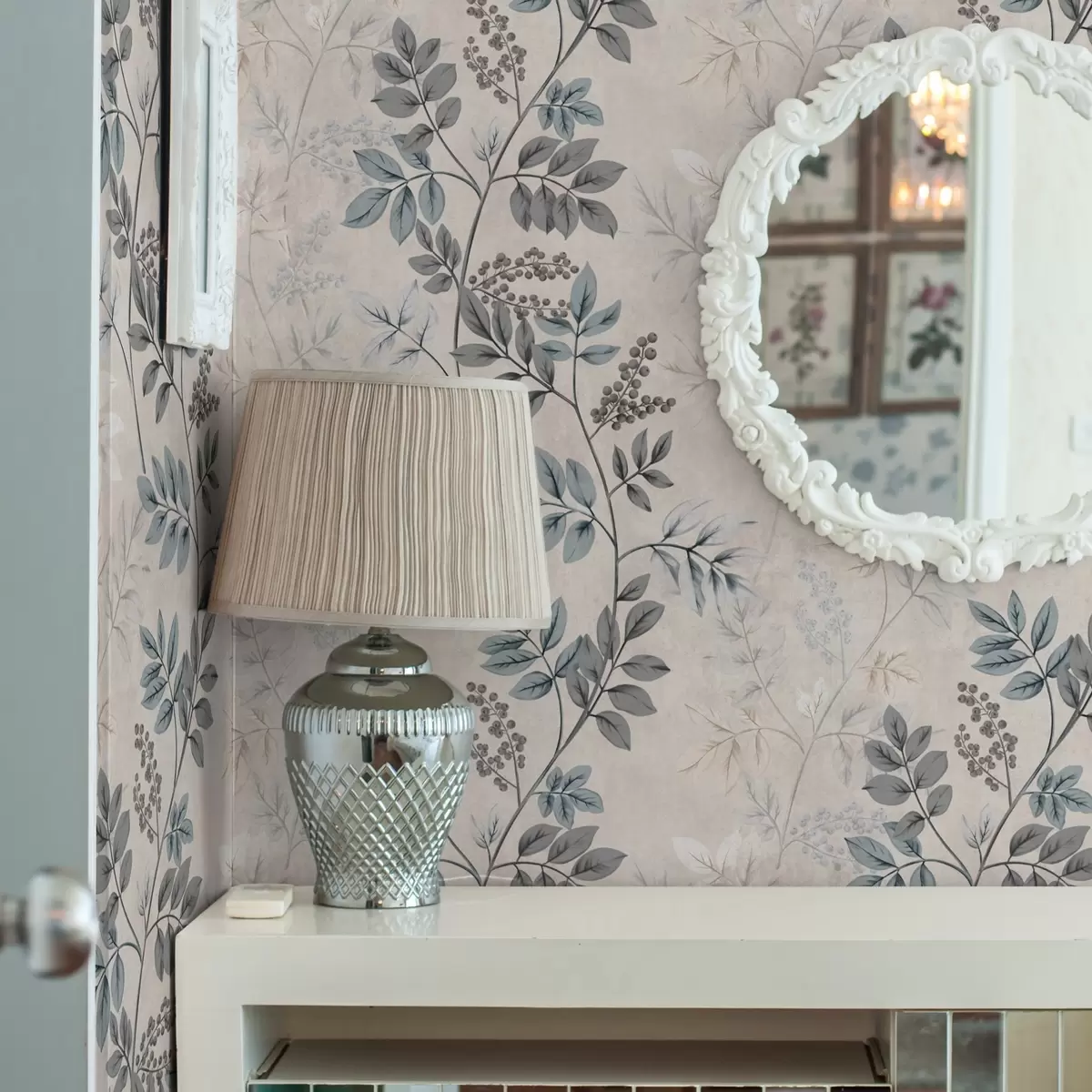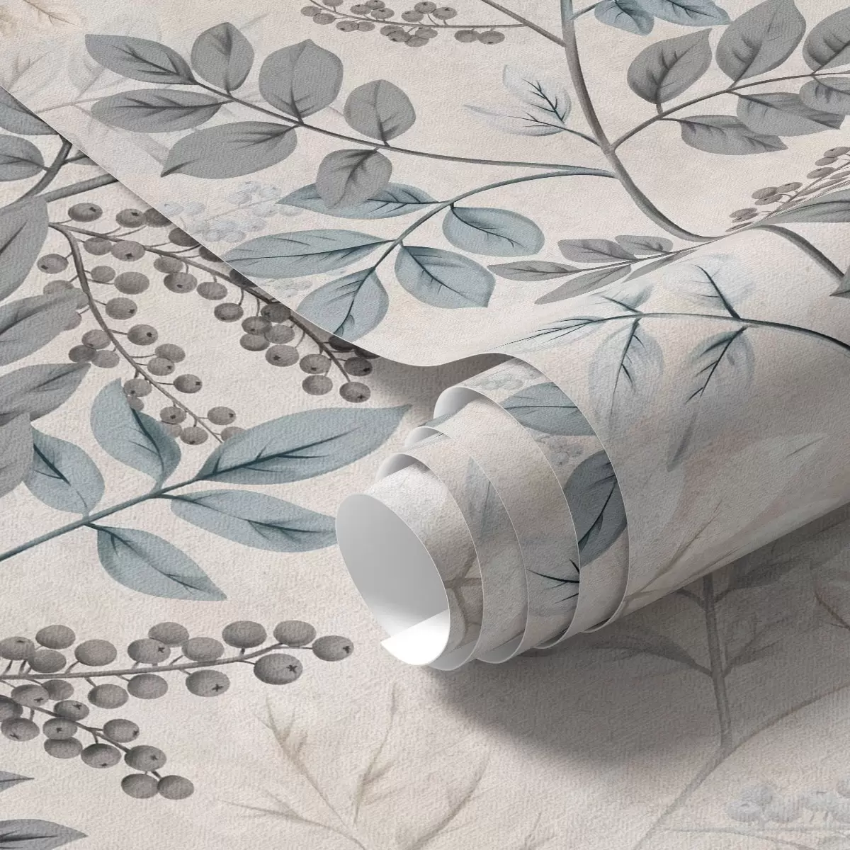 Tapet Ramuri de fructe de pădure în nuanțe pastelate cu frunze gri-albastru Nr. a00443