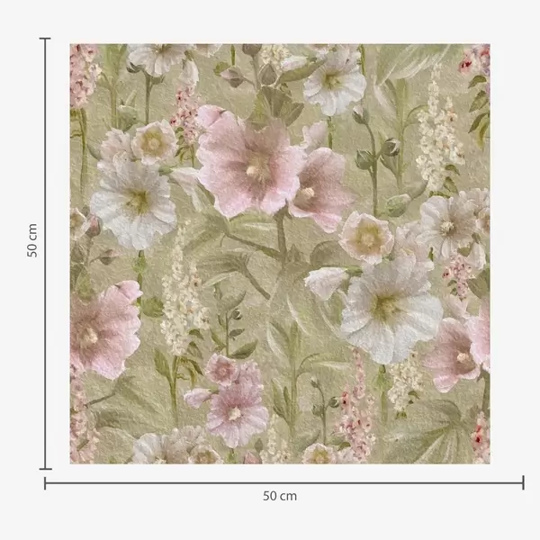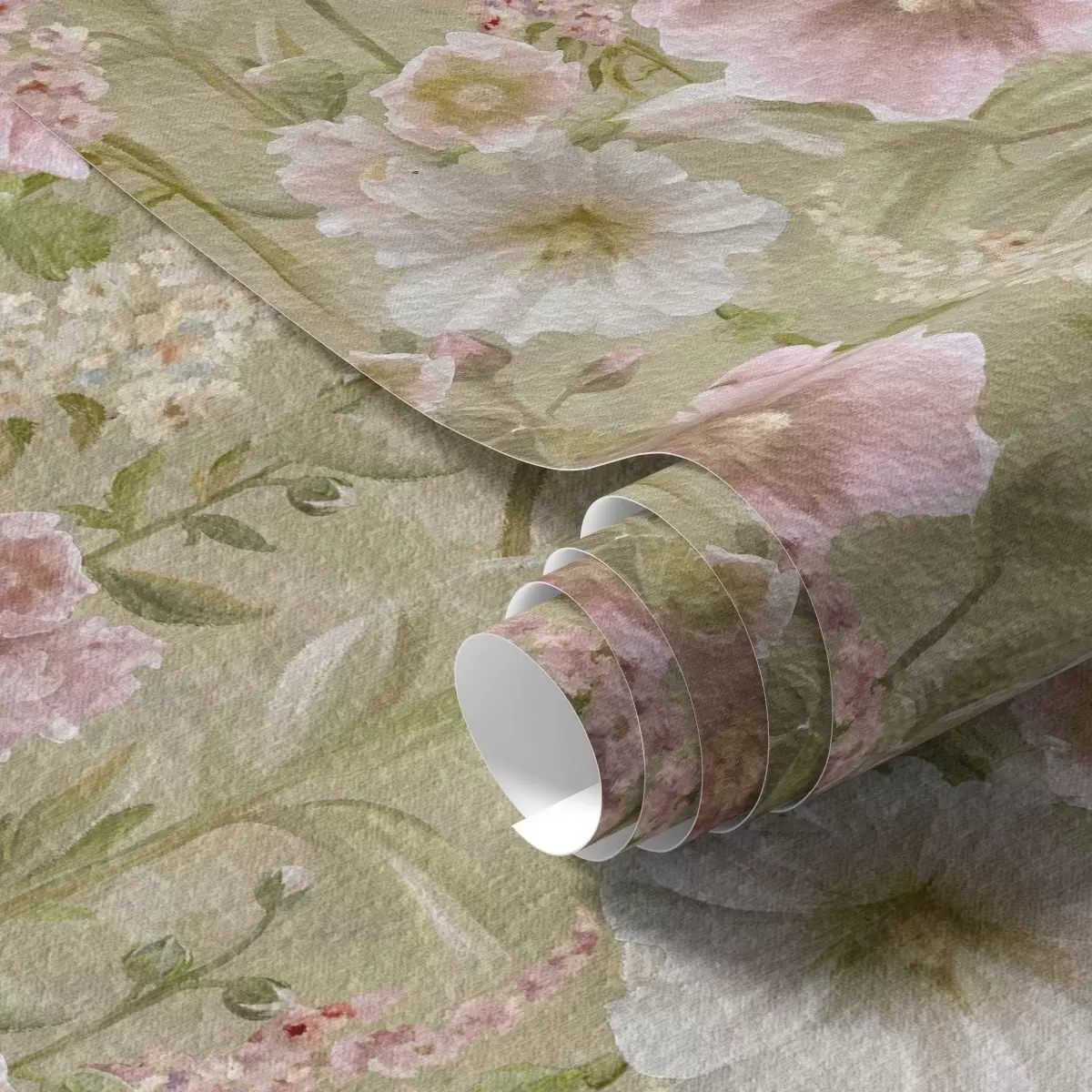 Tapet Hollyhocks roz și alb romantice pe verde mut Nr. a00456