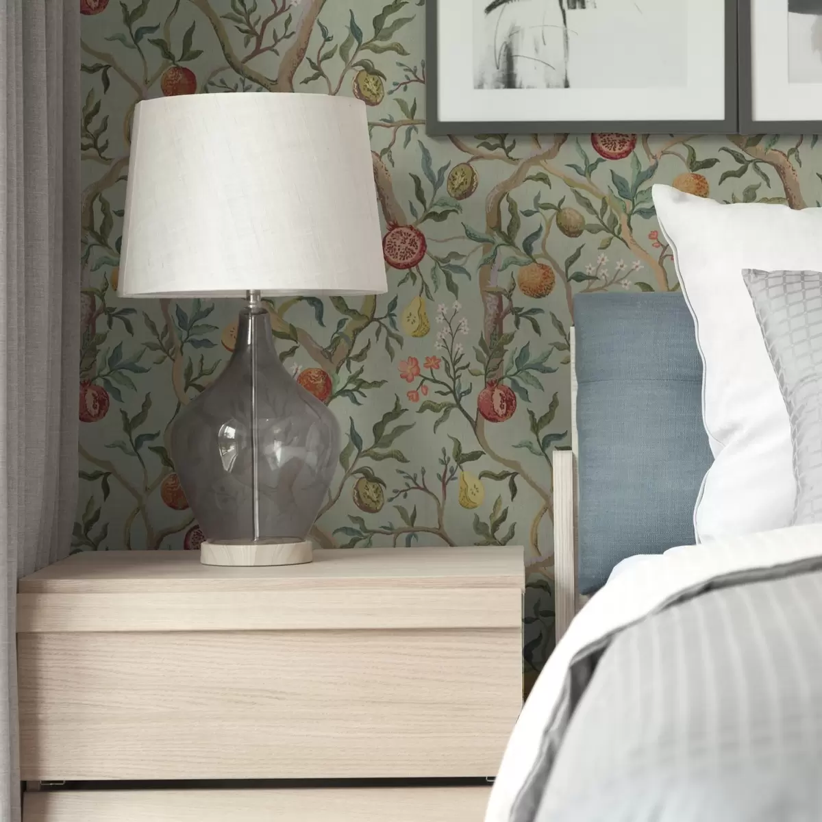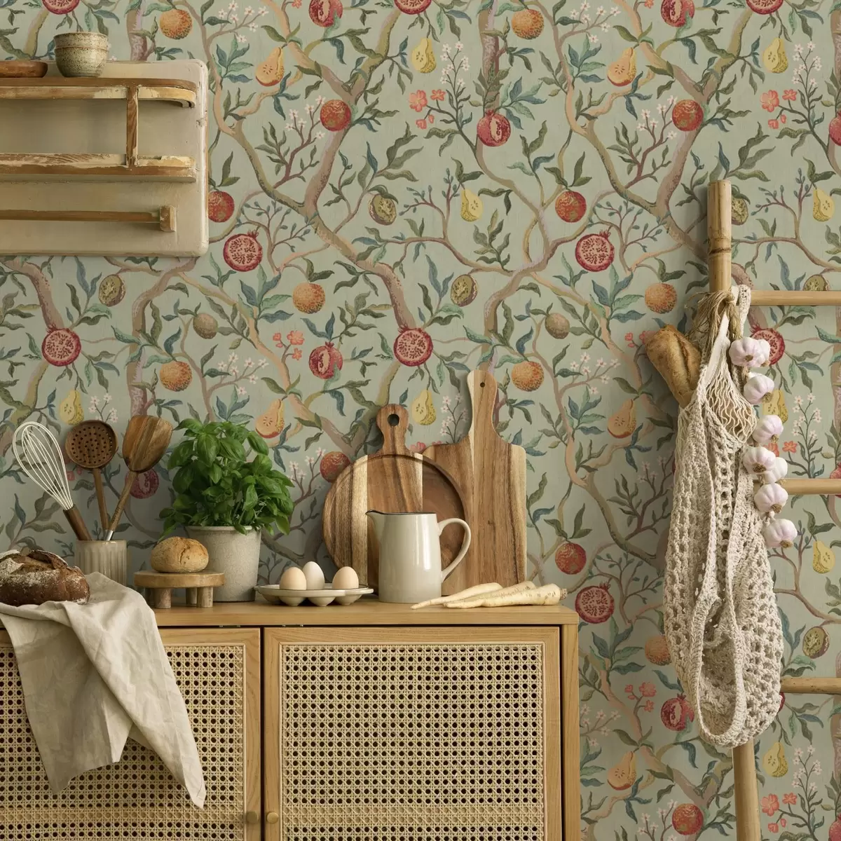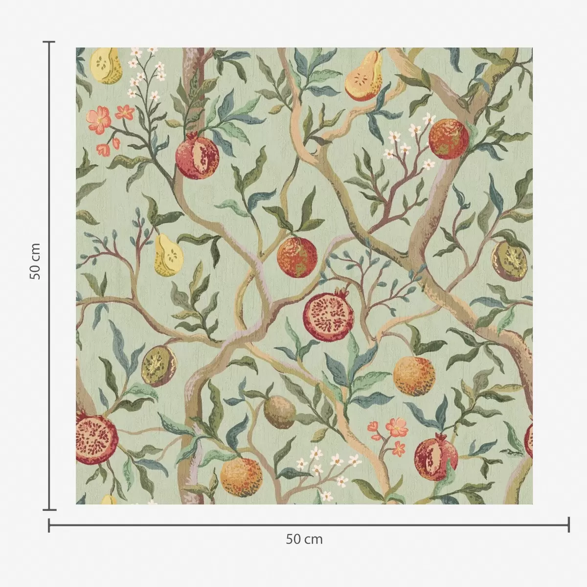 Tapet Rodie fructe, pere și flori pe un fundal verde pal Nr. a00465