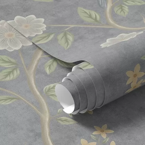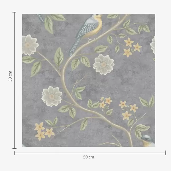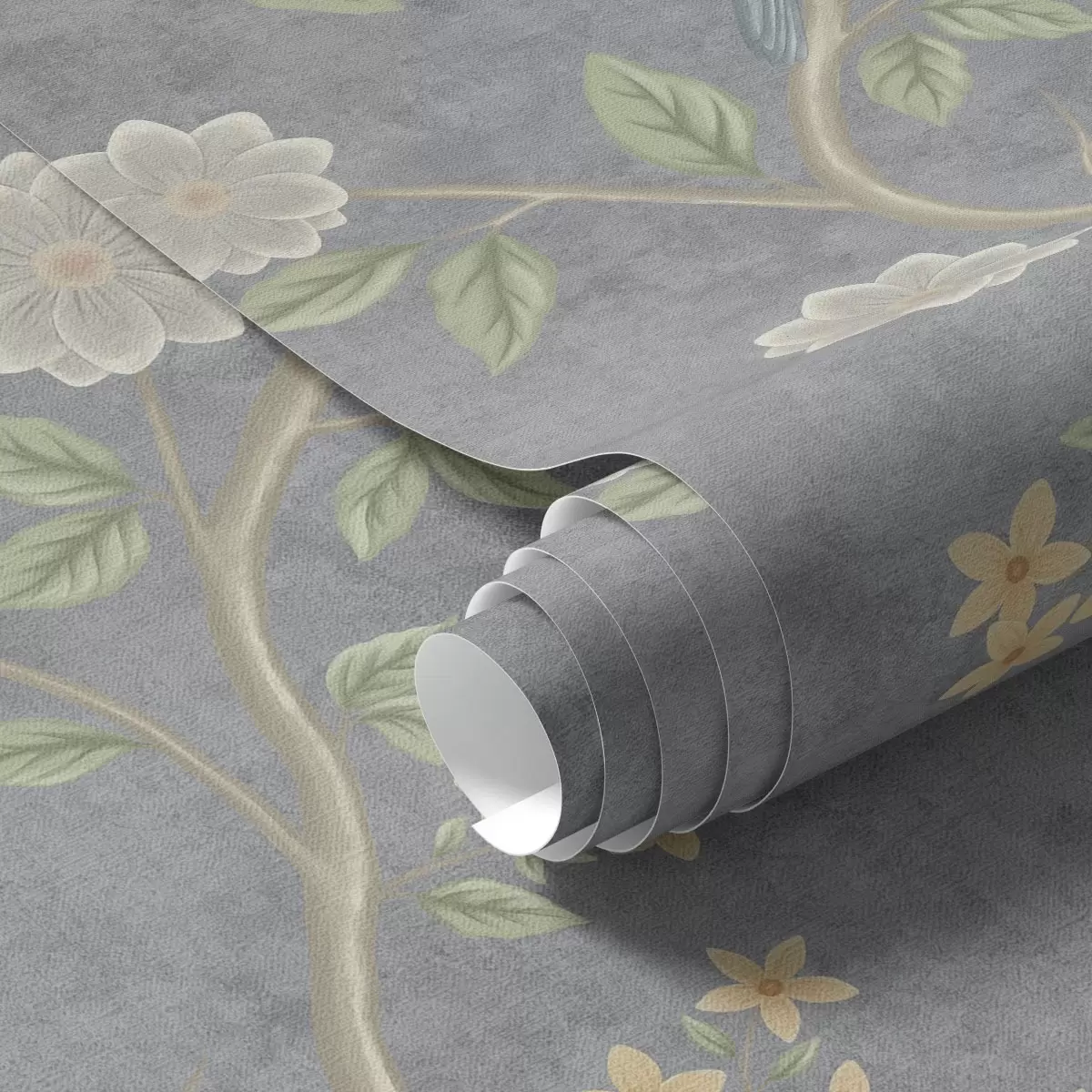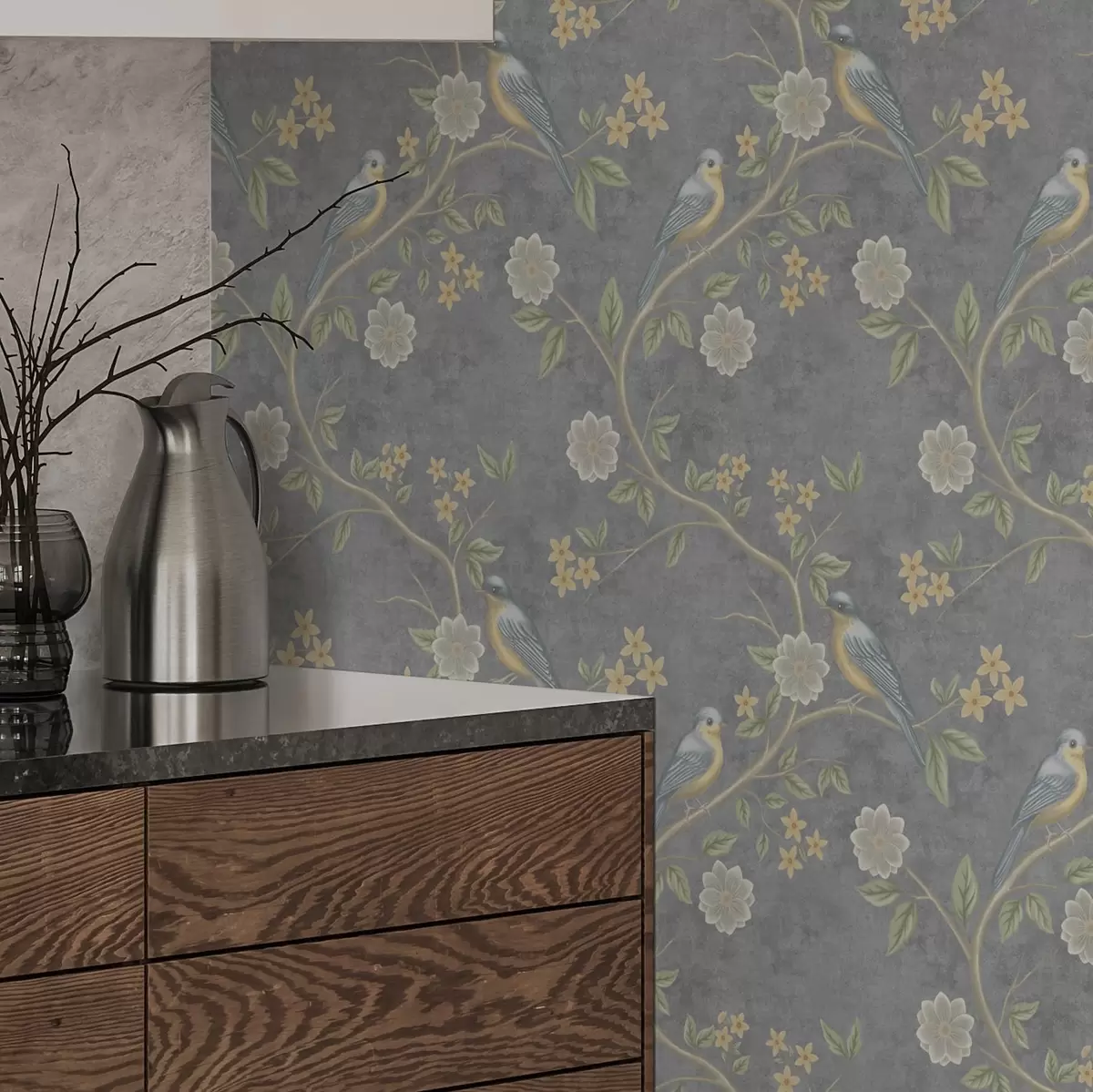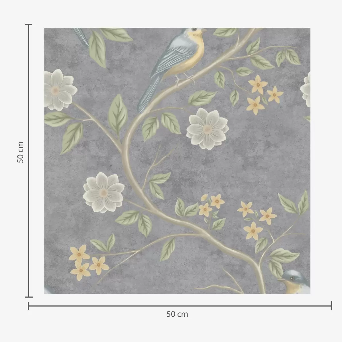 Tapet Păsări pe ramuri printre flori pe un fundal gri Nr. a00483