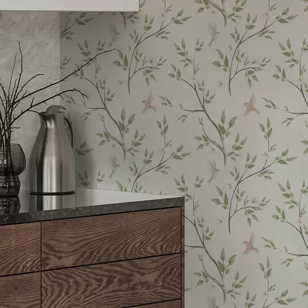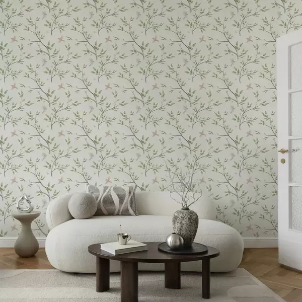 Tapet Ramuri pictate în acuarelă cu frunze și păsări pe un fundal deschis Nr. a00496