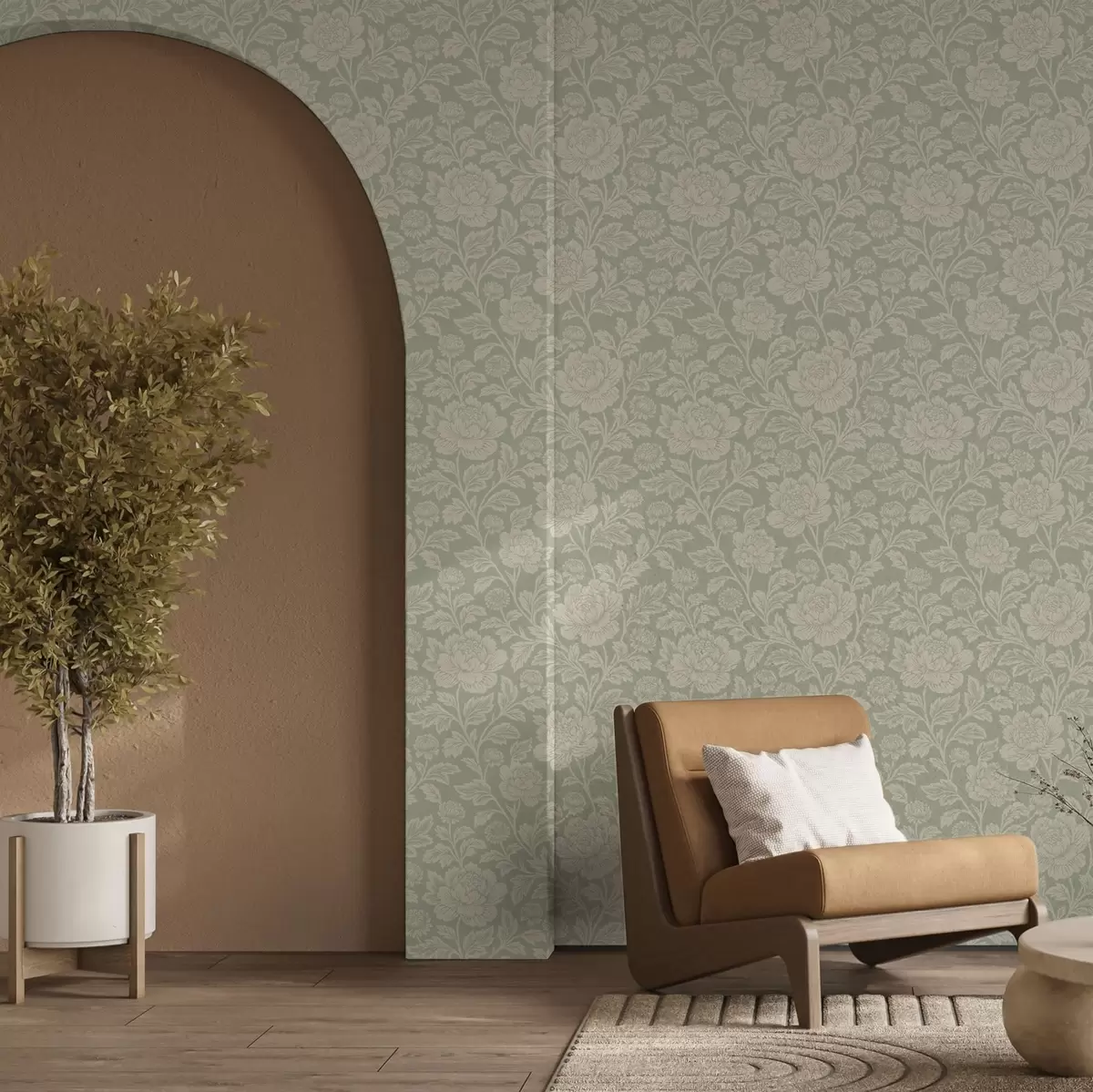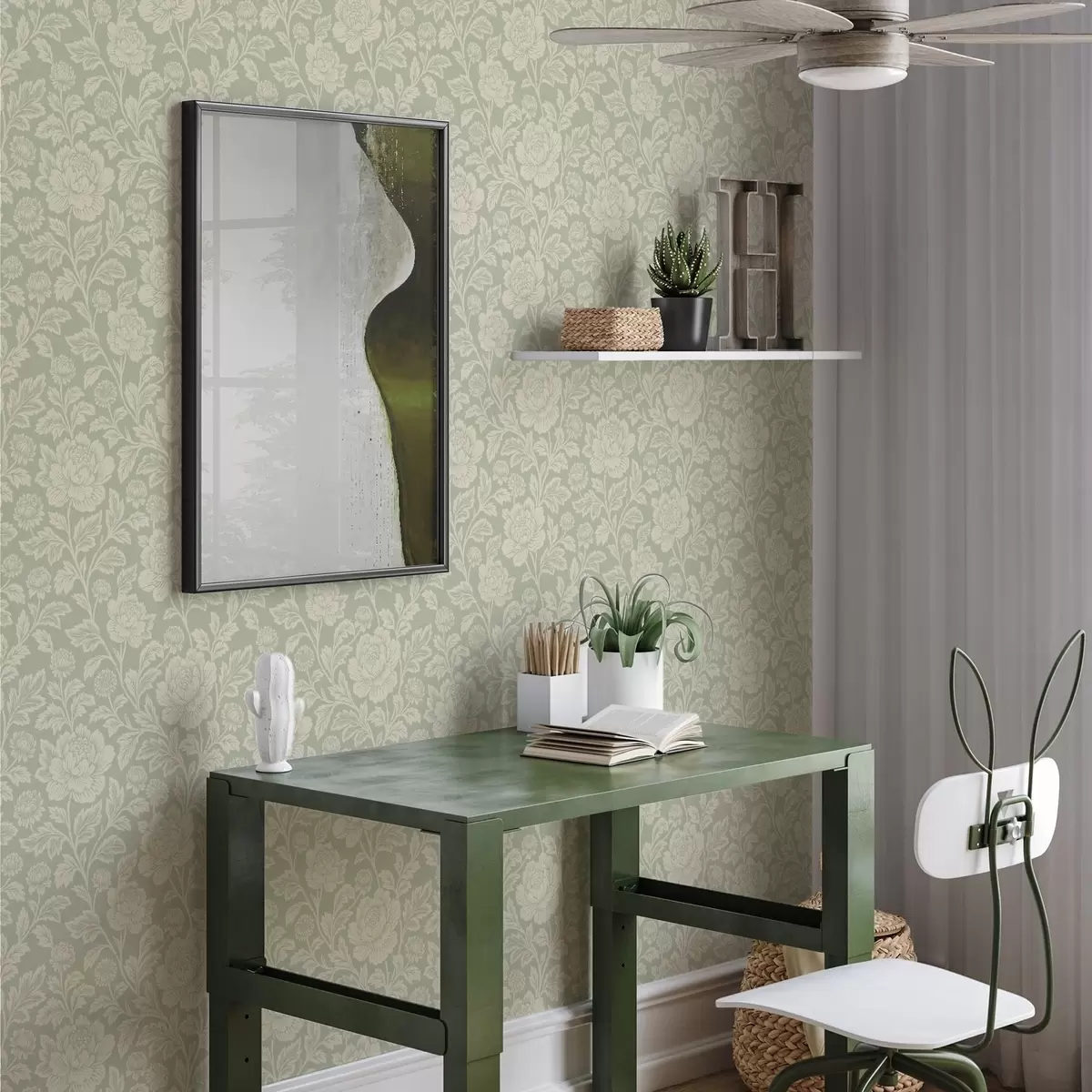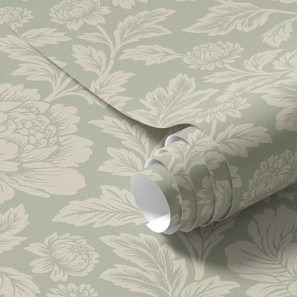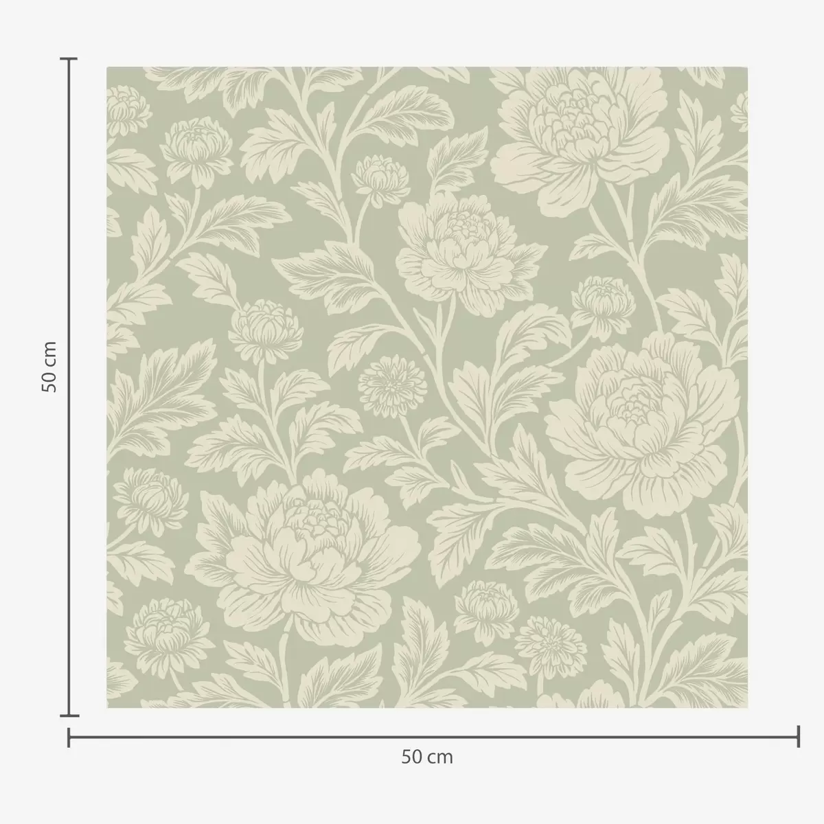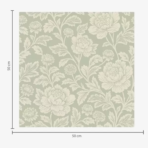 Tapet Bujori mari, desenați în stil line-art, pe un fundal de culoarea salviei Nr. a00582