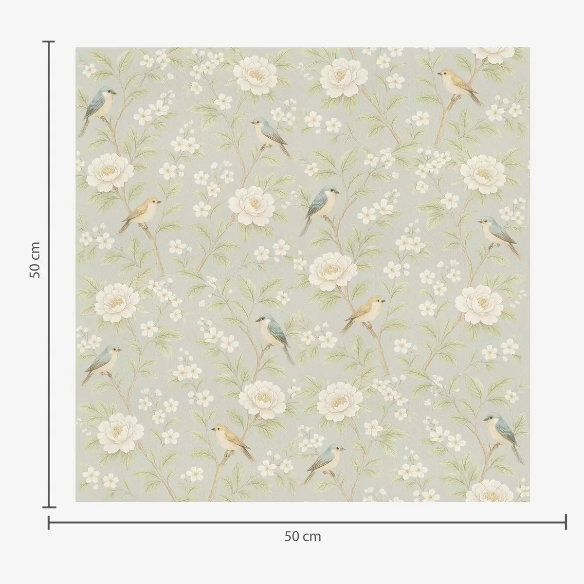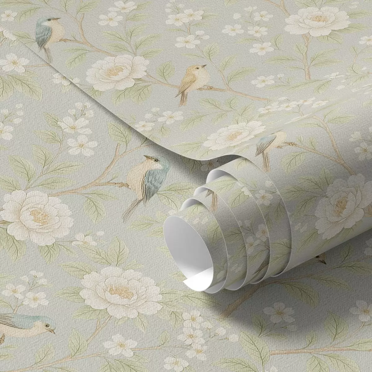 Tapet Păsări printre flori albe pe un fundal gri-verde Nr. a00583