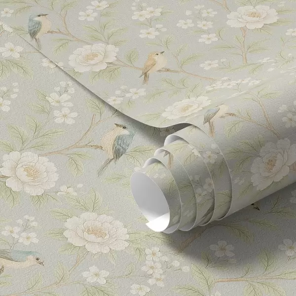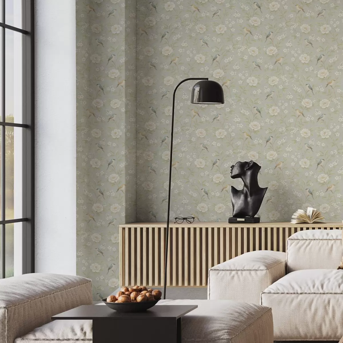 Wallpaper Păsări printre flori albe pe un fundal gri-verde a00583