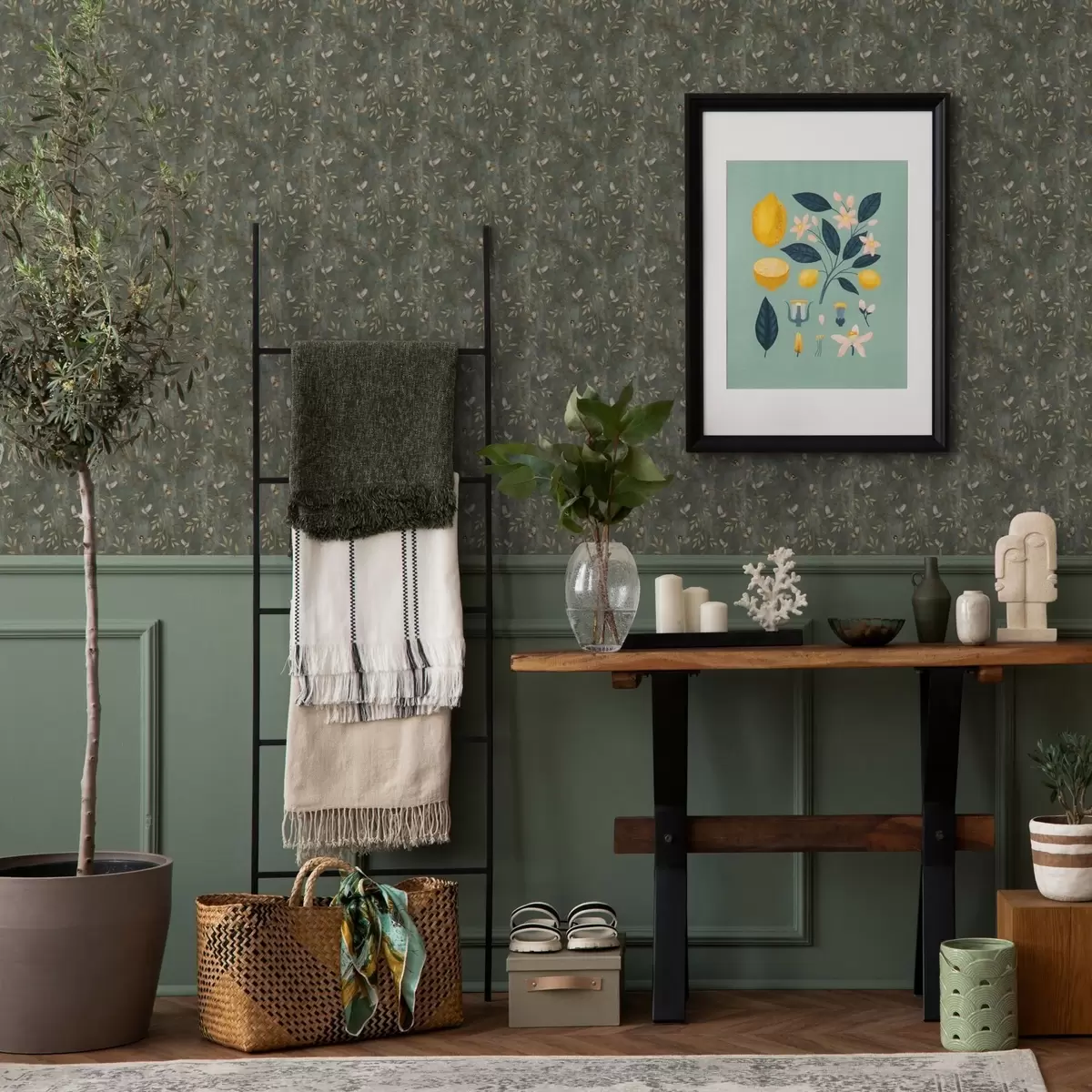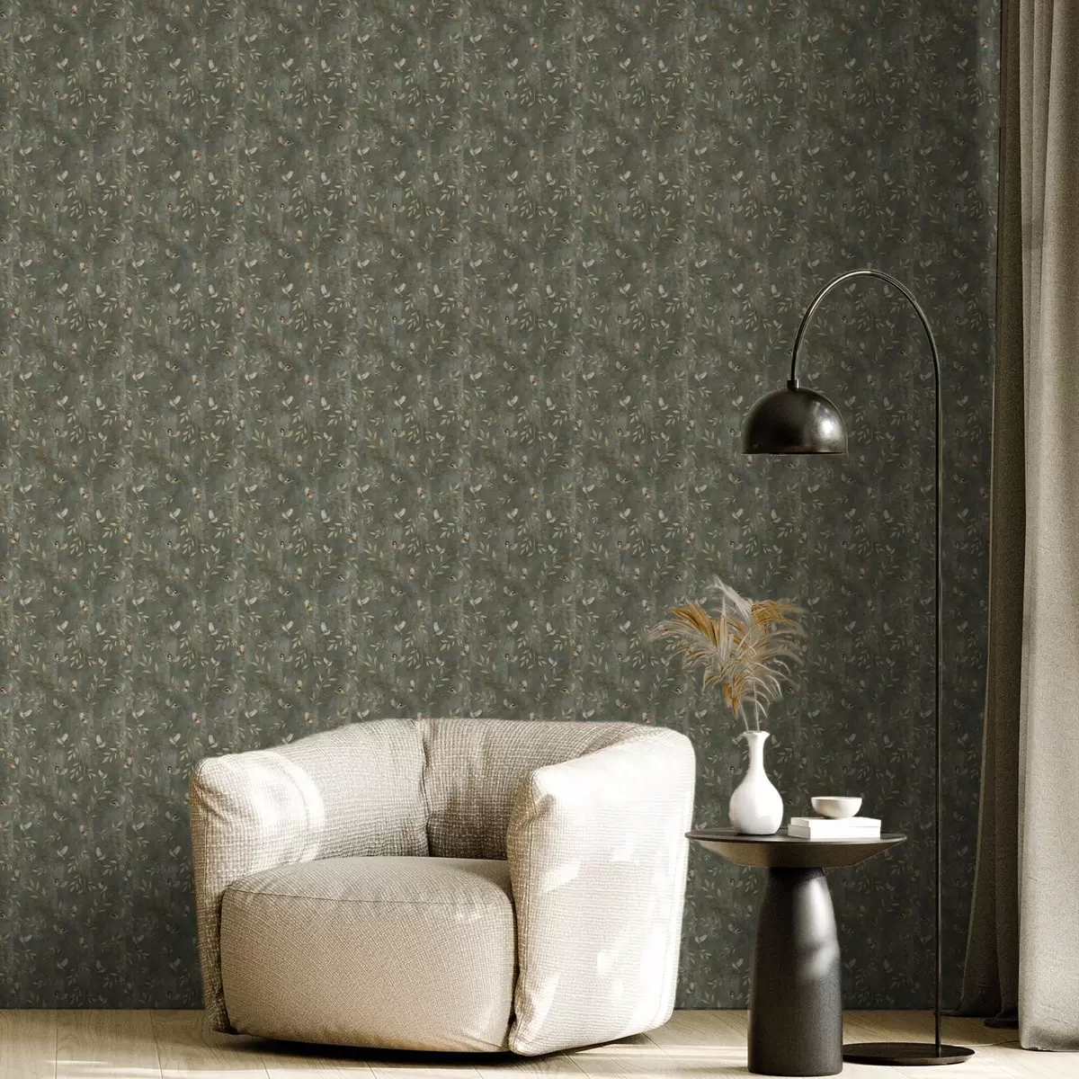 Tapet Păsări în frunziș portocaliu pe un fundal verde intens Nr. a00591