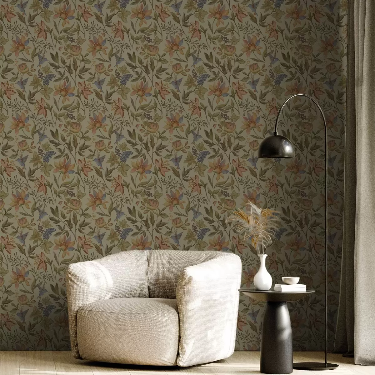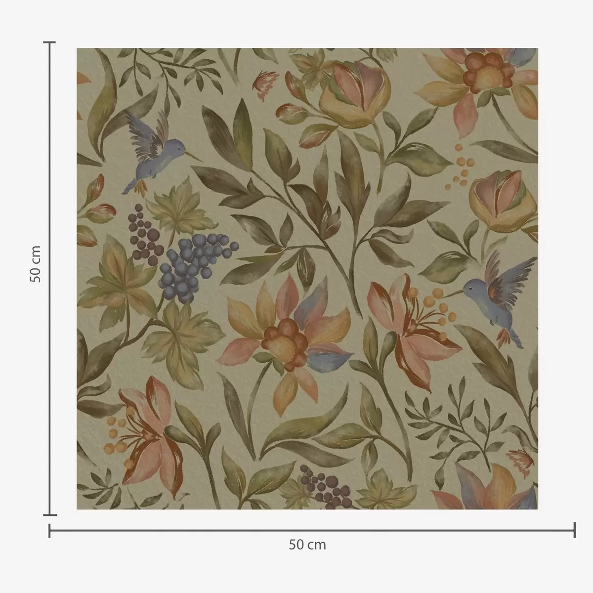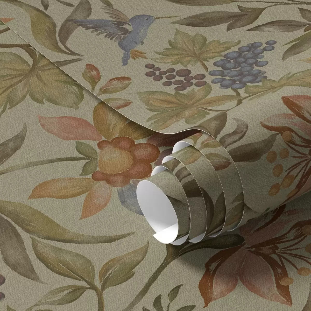 Tapet Flori și păsări vintage cu struguri pe un fundal de măsline Nr. a00594