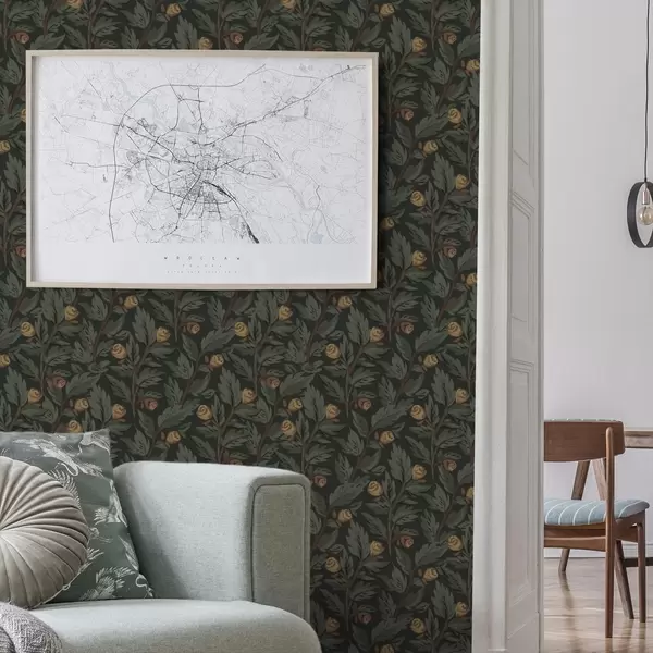 Tapet Model floral închis la culoare, cu muguri și frunze galbene Nr. a00598