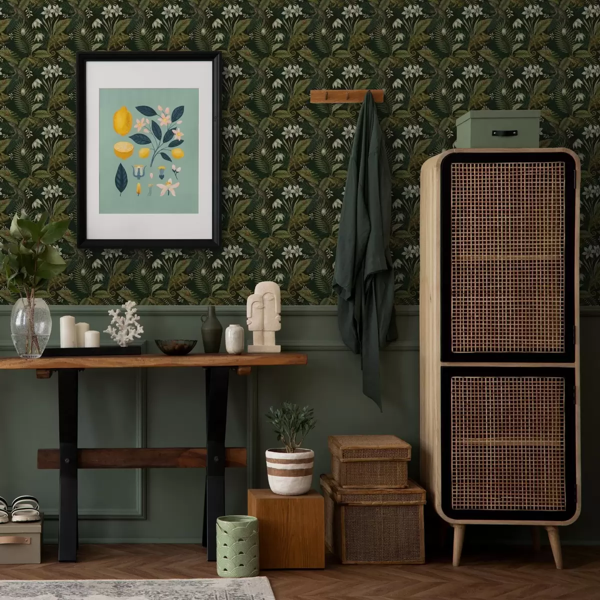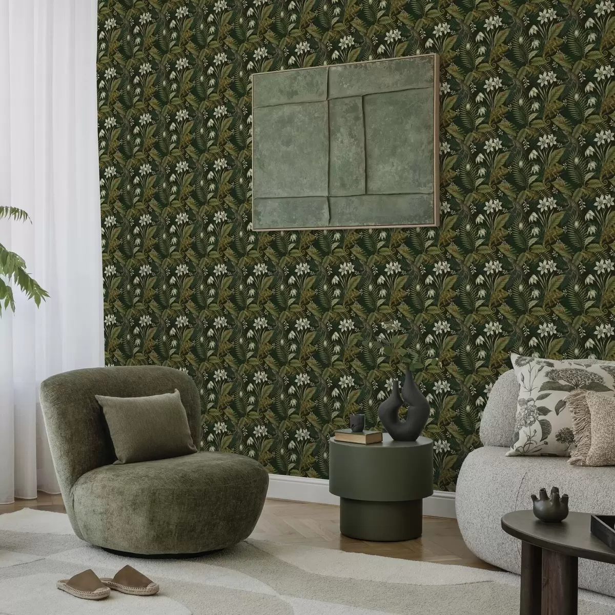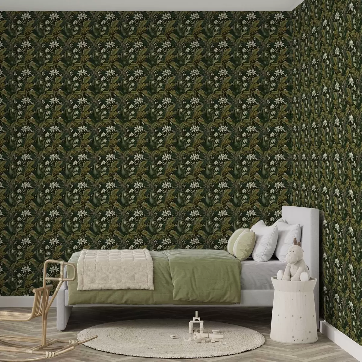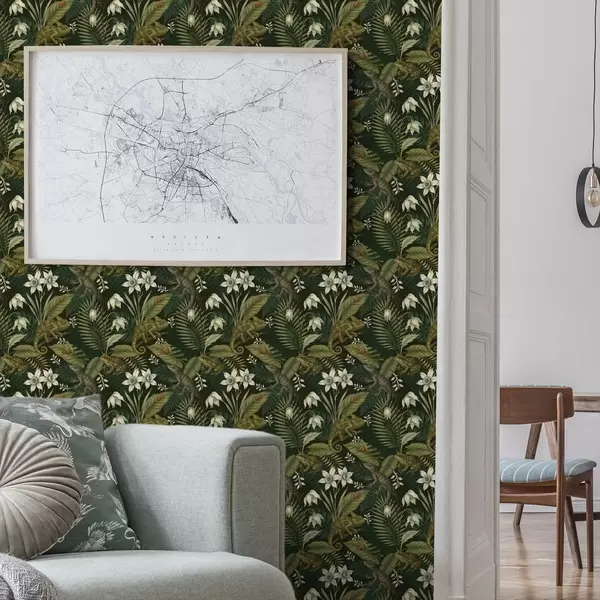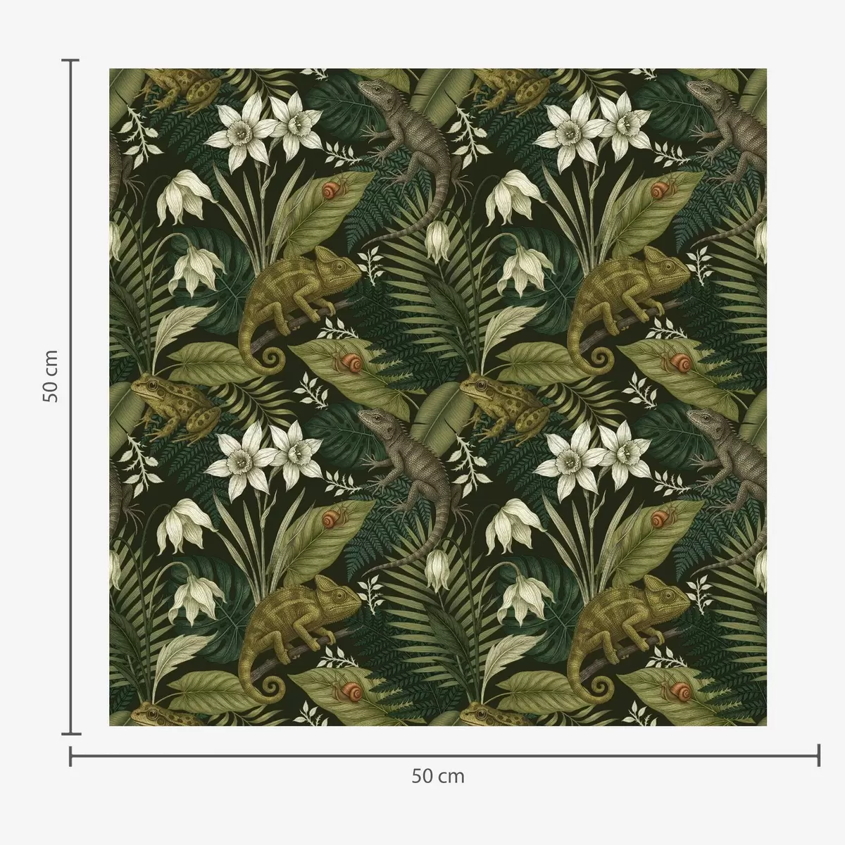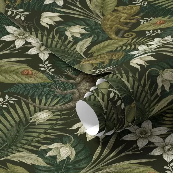 Tapet Cameleoni și frunze tropicale, flori albe, sol întunecat Nr. a00608v1