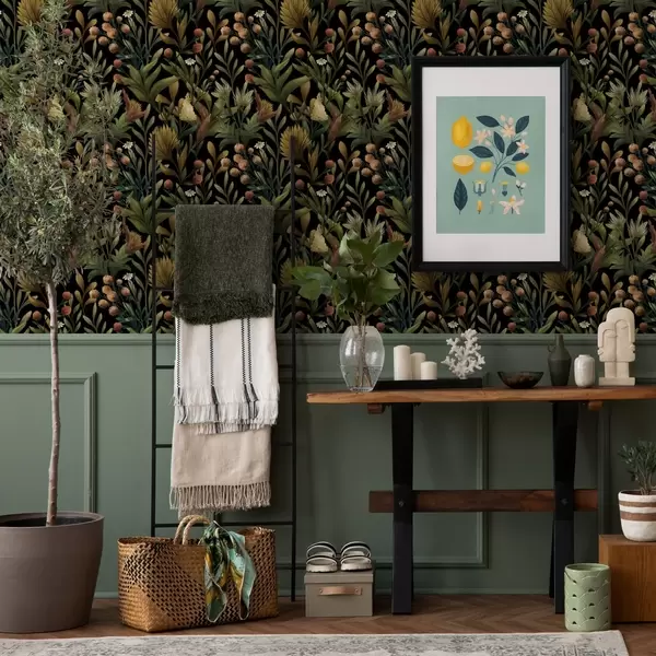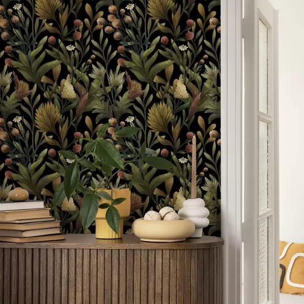Tapet Grădină botanică pe fundal negru, paletă caldă de toamnă Nr. a00619