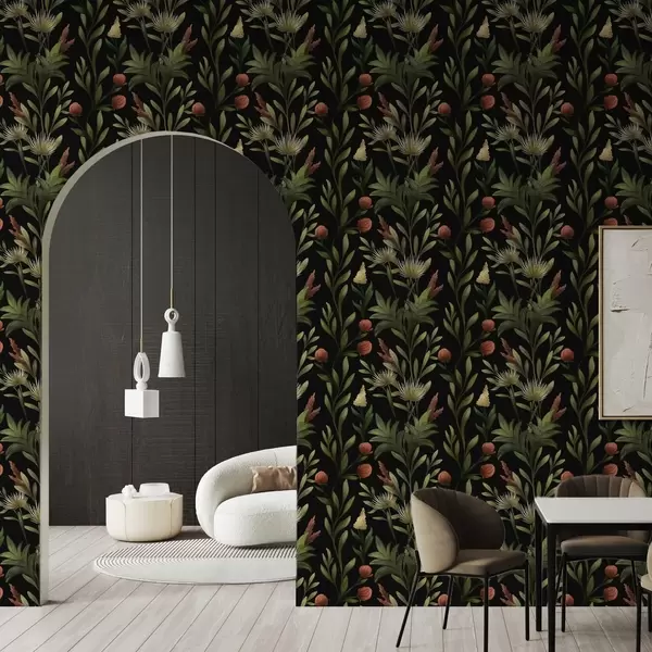 Tapet Ierburi înalte și flori pe fond negru, imprimeu detaliat Nr. a00620