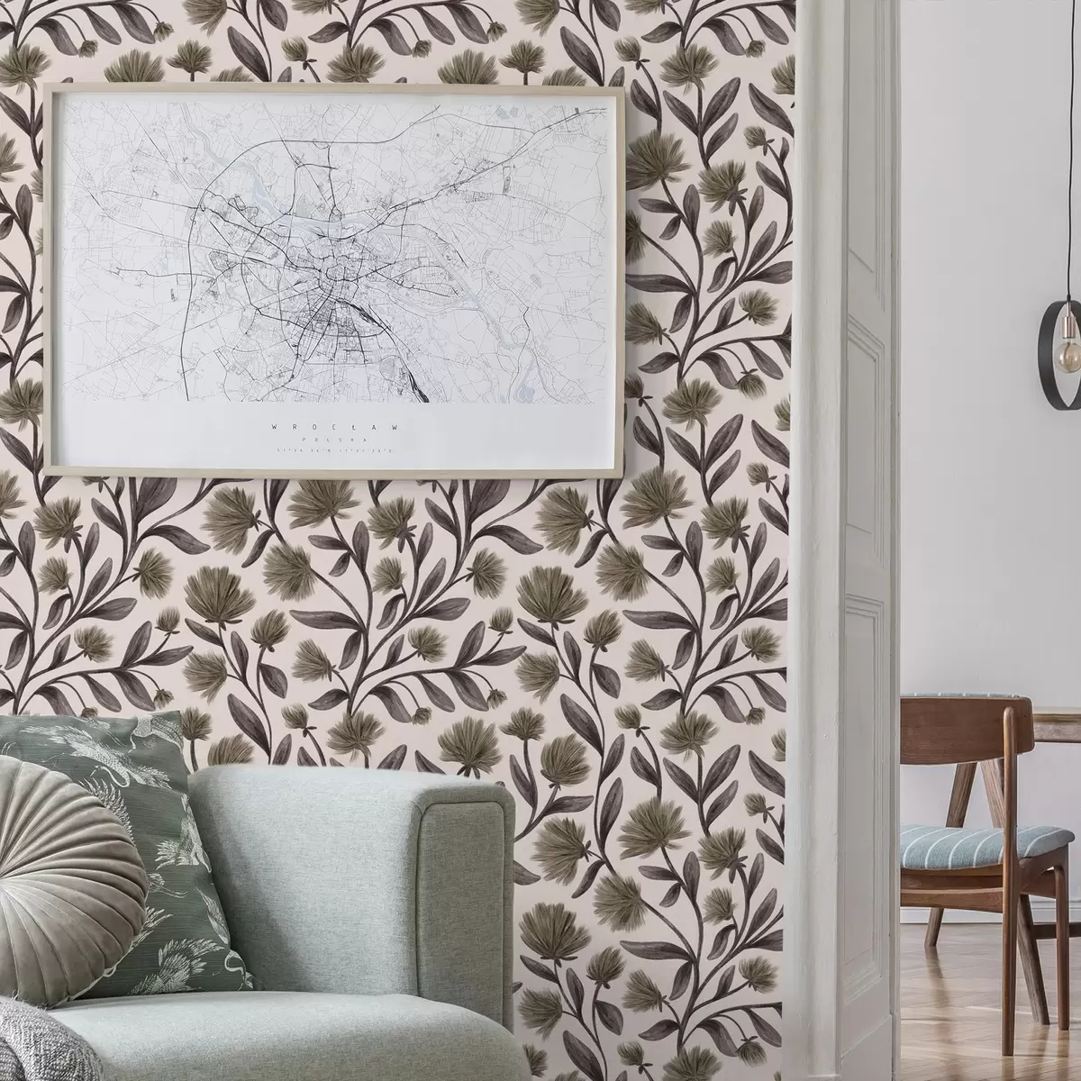 Tapet Flori sălbatice în nuanțe de gri-măsliniu pe fond crem Nr. a00623v1