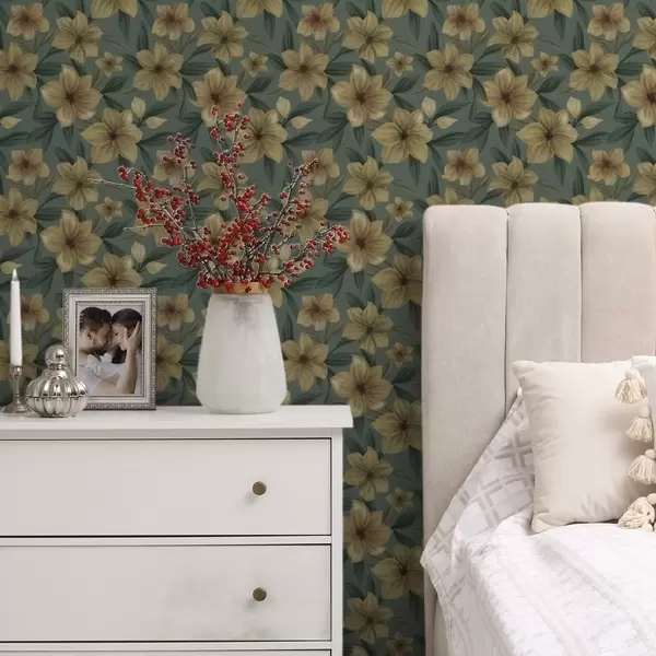 Tapet Flori ocru pe un fundal verde intens, model dens Nr. a00628