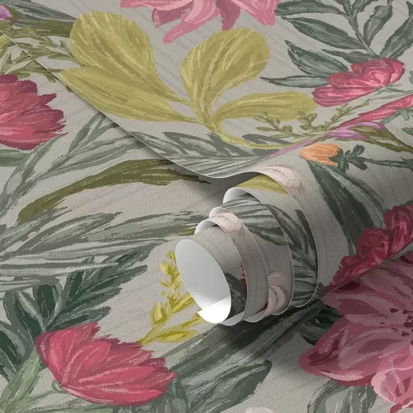 Tapet Flori luxuriante roz și crem pe fond gri, textură impasto Nr. a00629