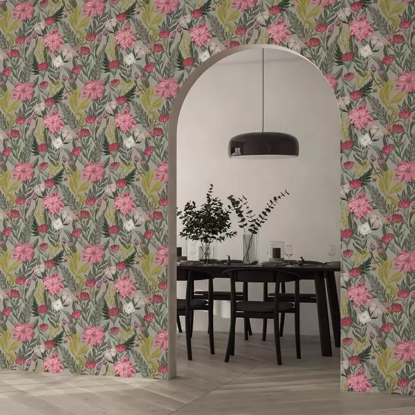 Tapet Flori luxuriante roz și crem pe fond gri, textură impasto Nr. a00629