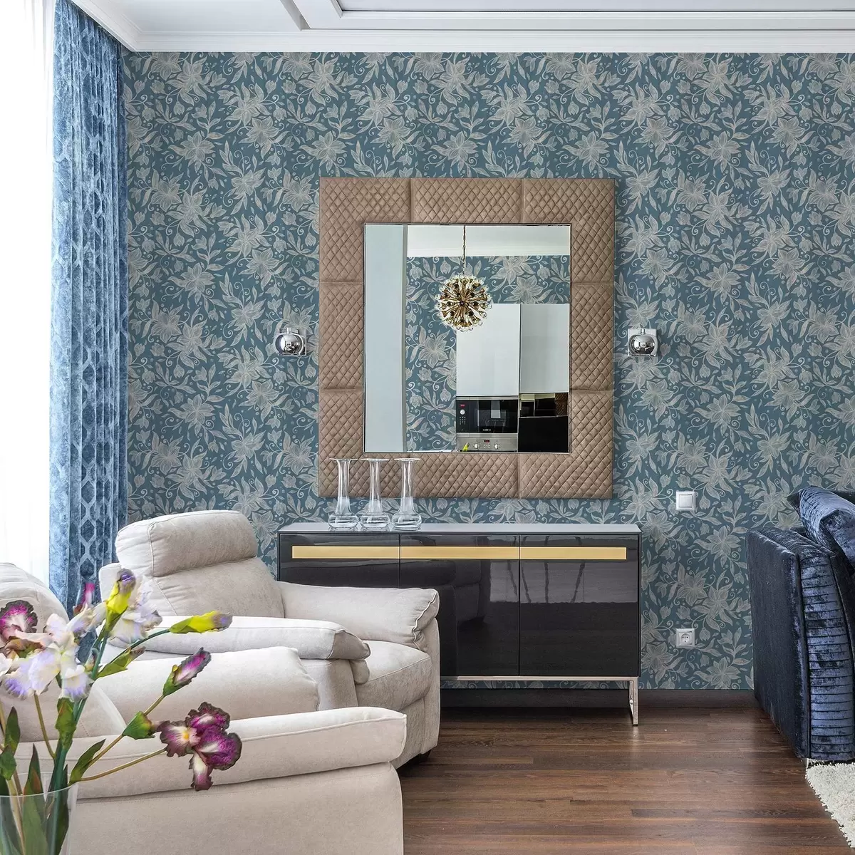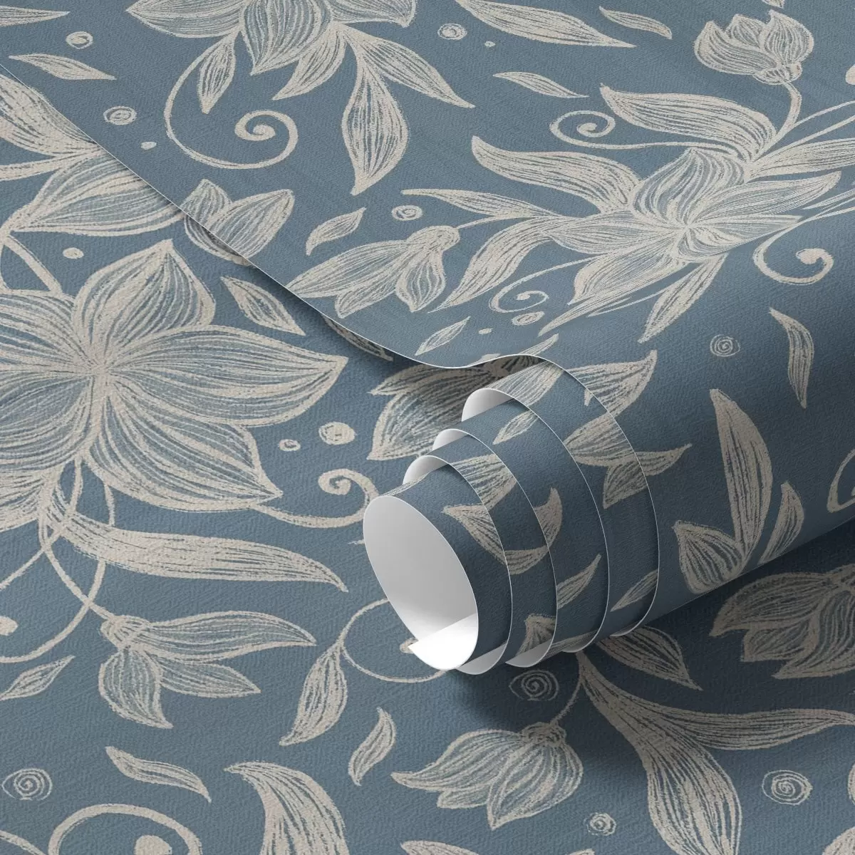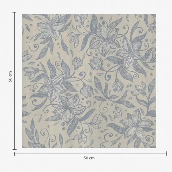 Tapet Flori crem liniare pe fond albastru, volute delicate Nr. a00630