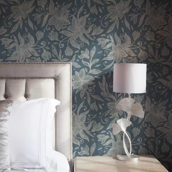 Tapet Flori crem liniare pe fond albastru, volute delicate Nr. a00630