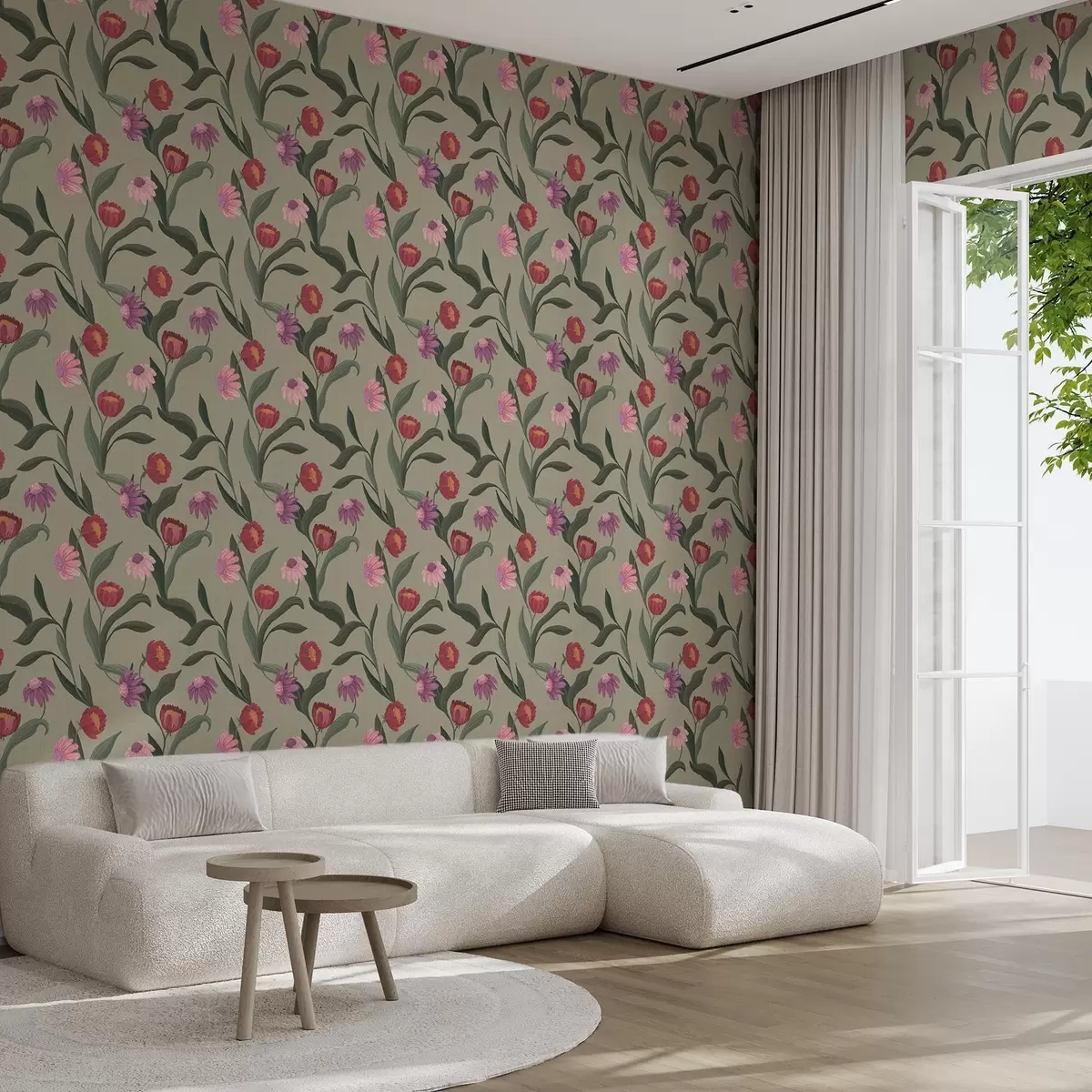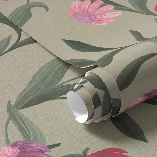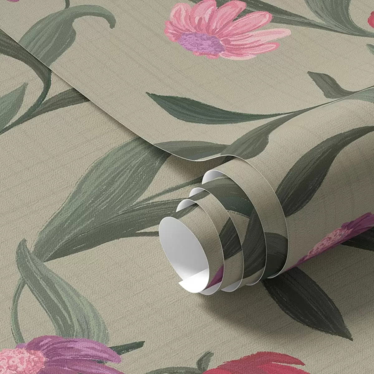 Tapet Flori roz-roșii pe fundal măslin, textură pânză Nr. a00631v1