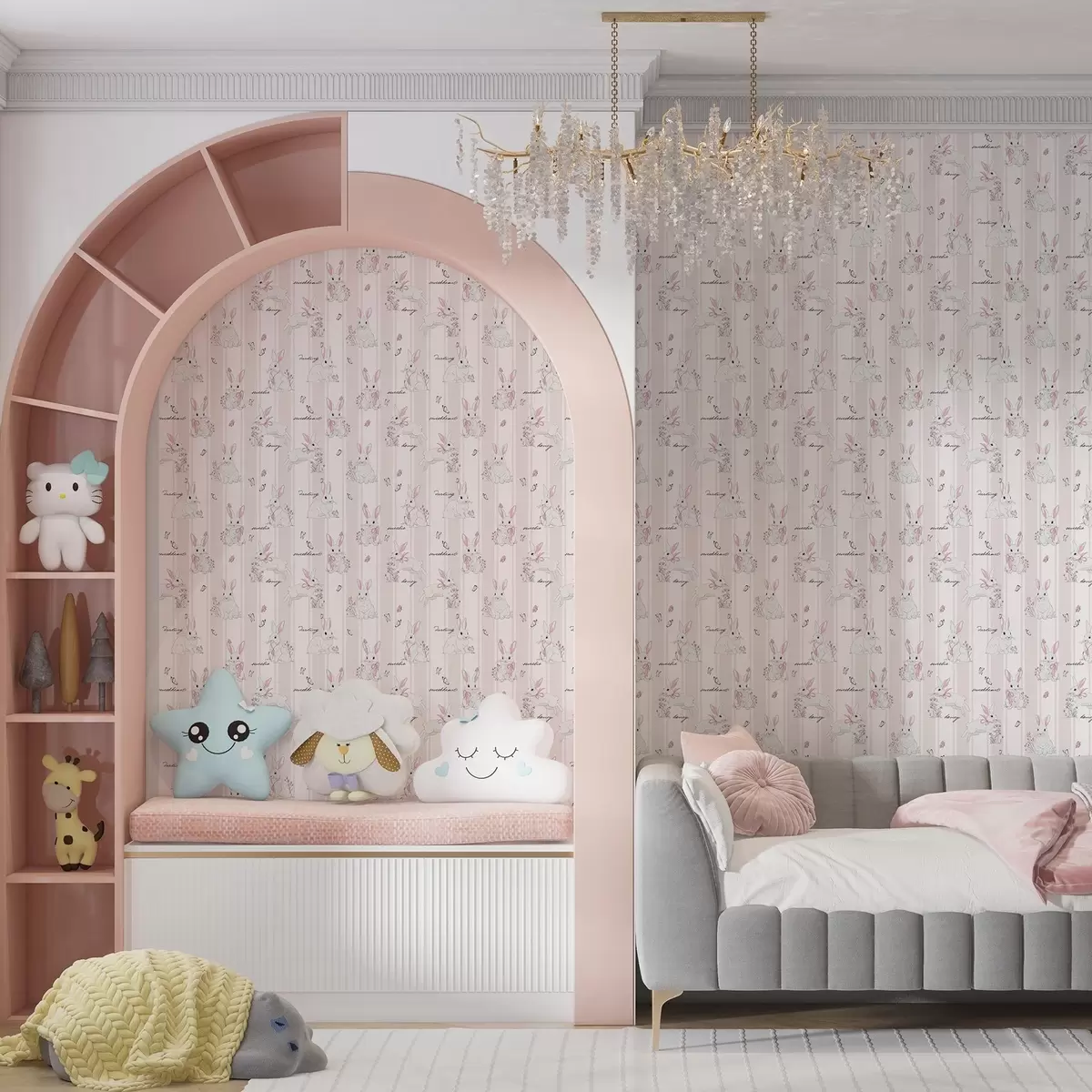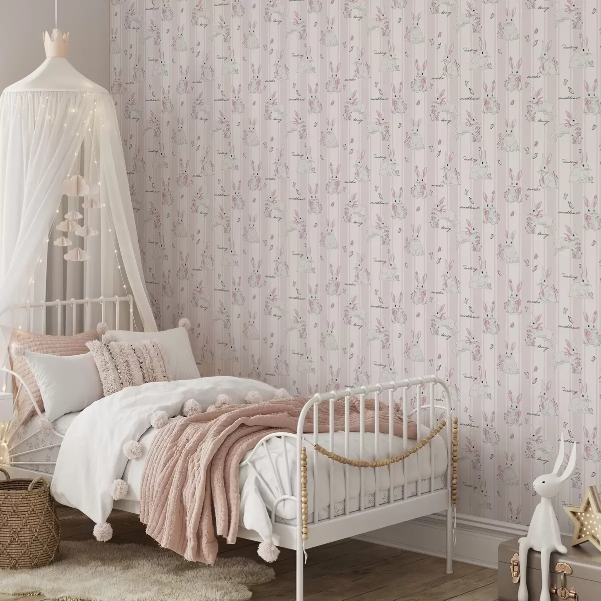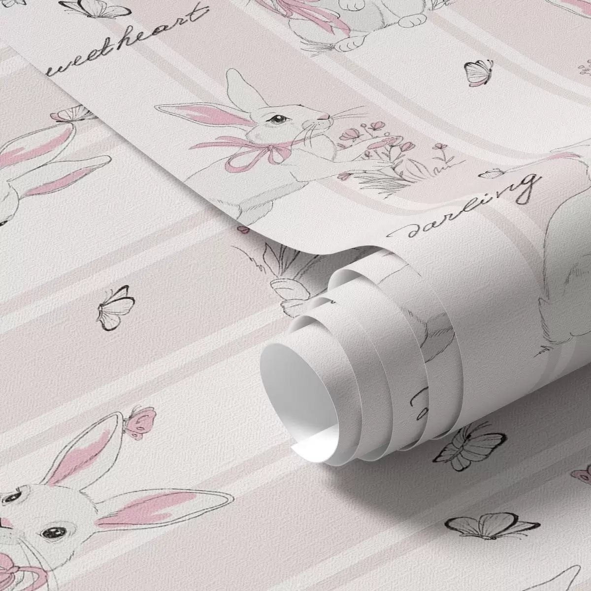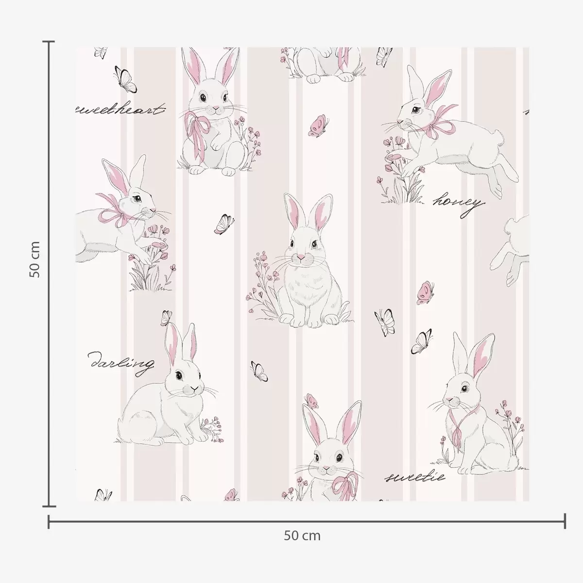 Tapet Iepurași cu fundițe, dungi roz și inscripții mici Nr. a00657