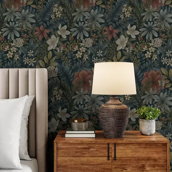 Wallpaper Fundal întunecat cu flori și frunze dense în tonuri calde a00678