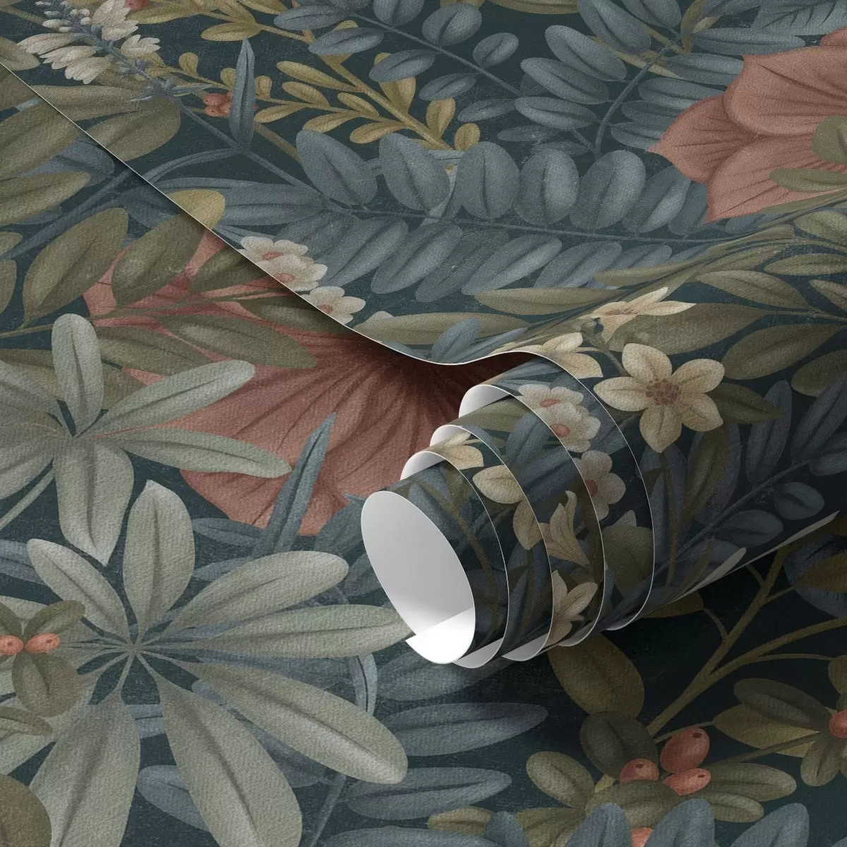 Tapet Fundal întunecat cu flori și frunze dense în tonuri calde Nr. a00678