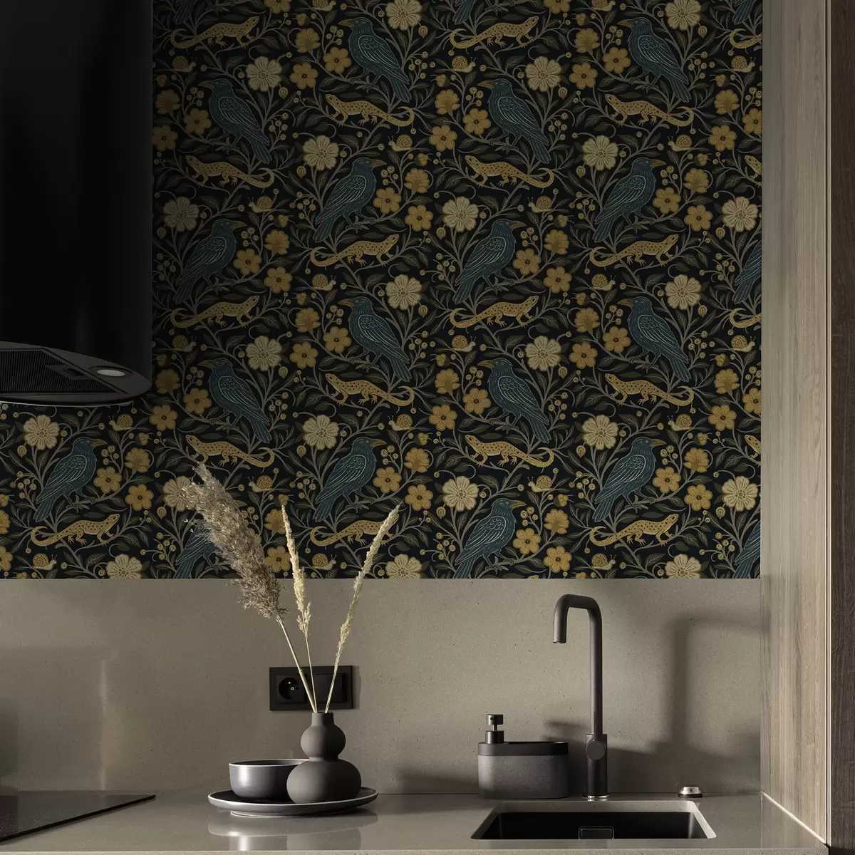 Tapet Păsări, șopârle și melci printre flori pe un fundal întunecat Nr. a00691