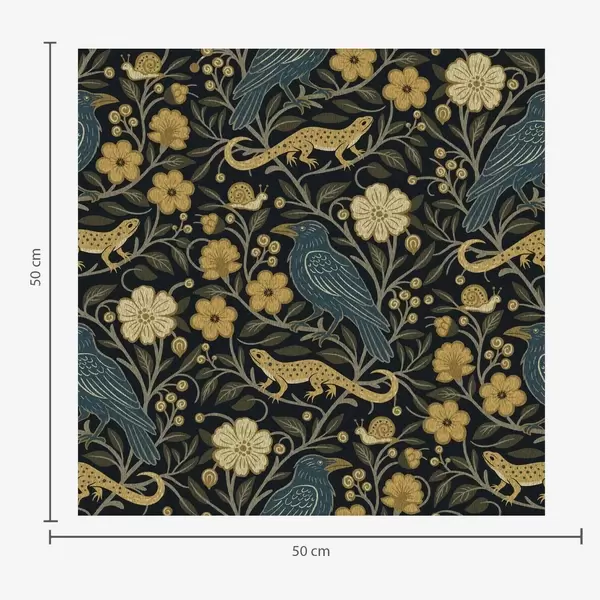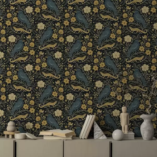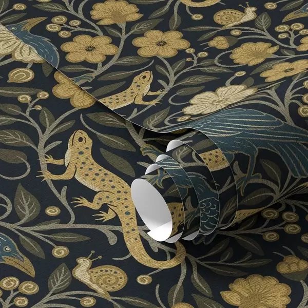 Tapet Păsări, șopârle și melci printre flori pe un fundal întunecat Nr. a00691