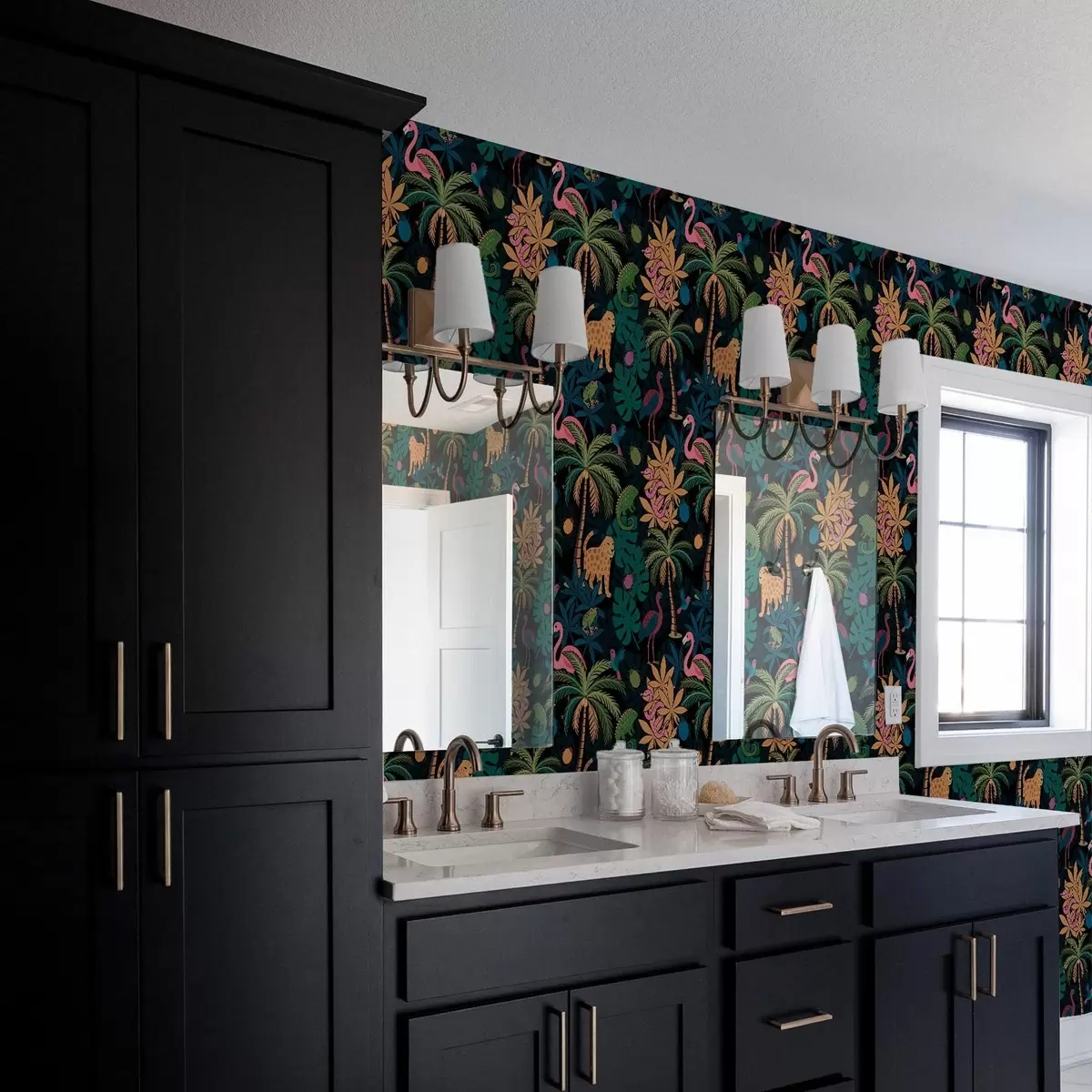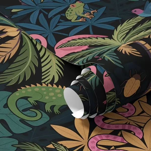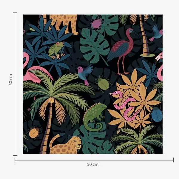 Tapet Animale tropicale viu colorate printre frunze, pe un fundal întunecat Nr. a00701