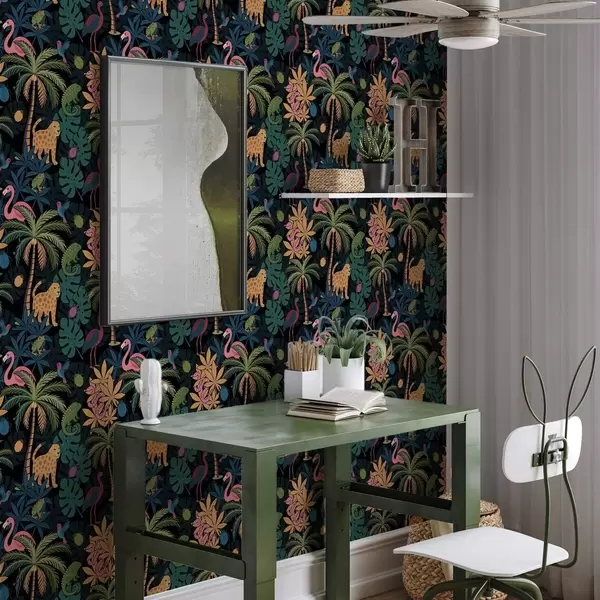 Tapet Animale tropicale viu colorate printre frunze, pe un fundal întunecat Nr. a00701