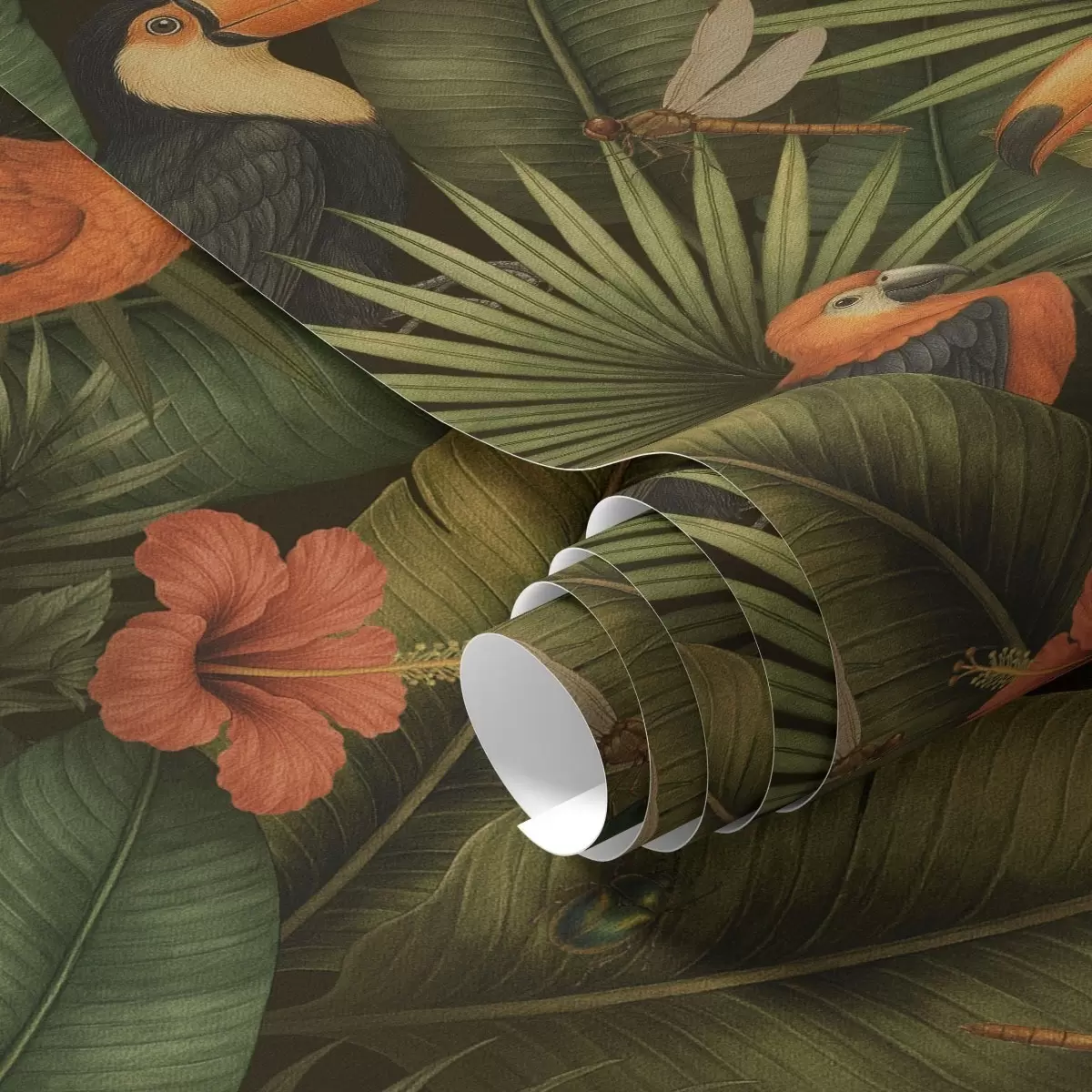 Wallpaper Tucani și papagali printre frunzișul tropical și flori a00702