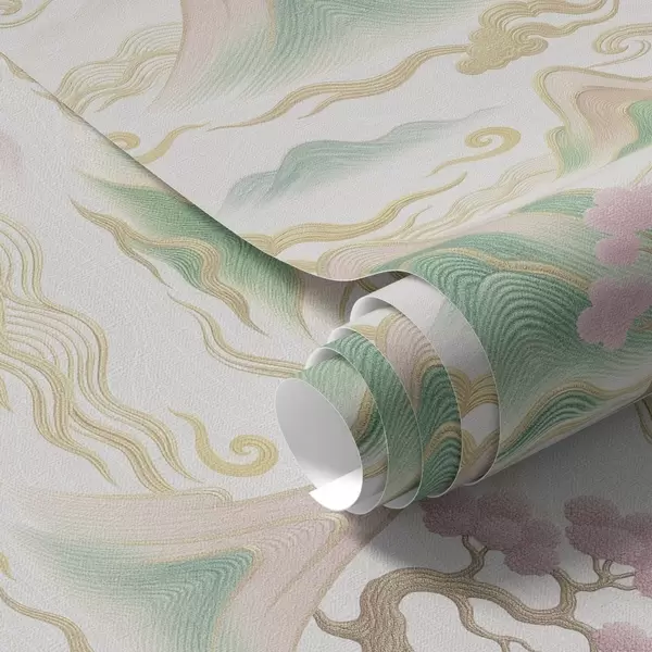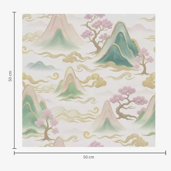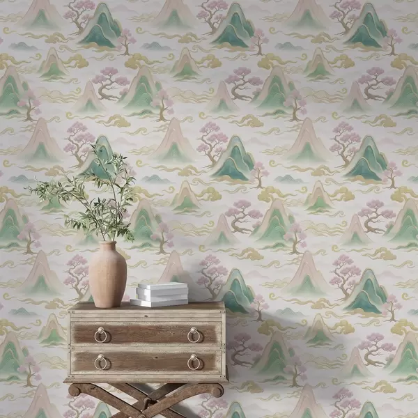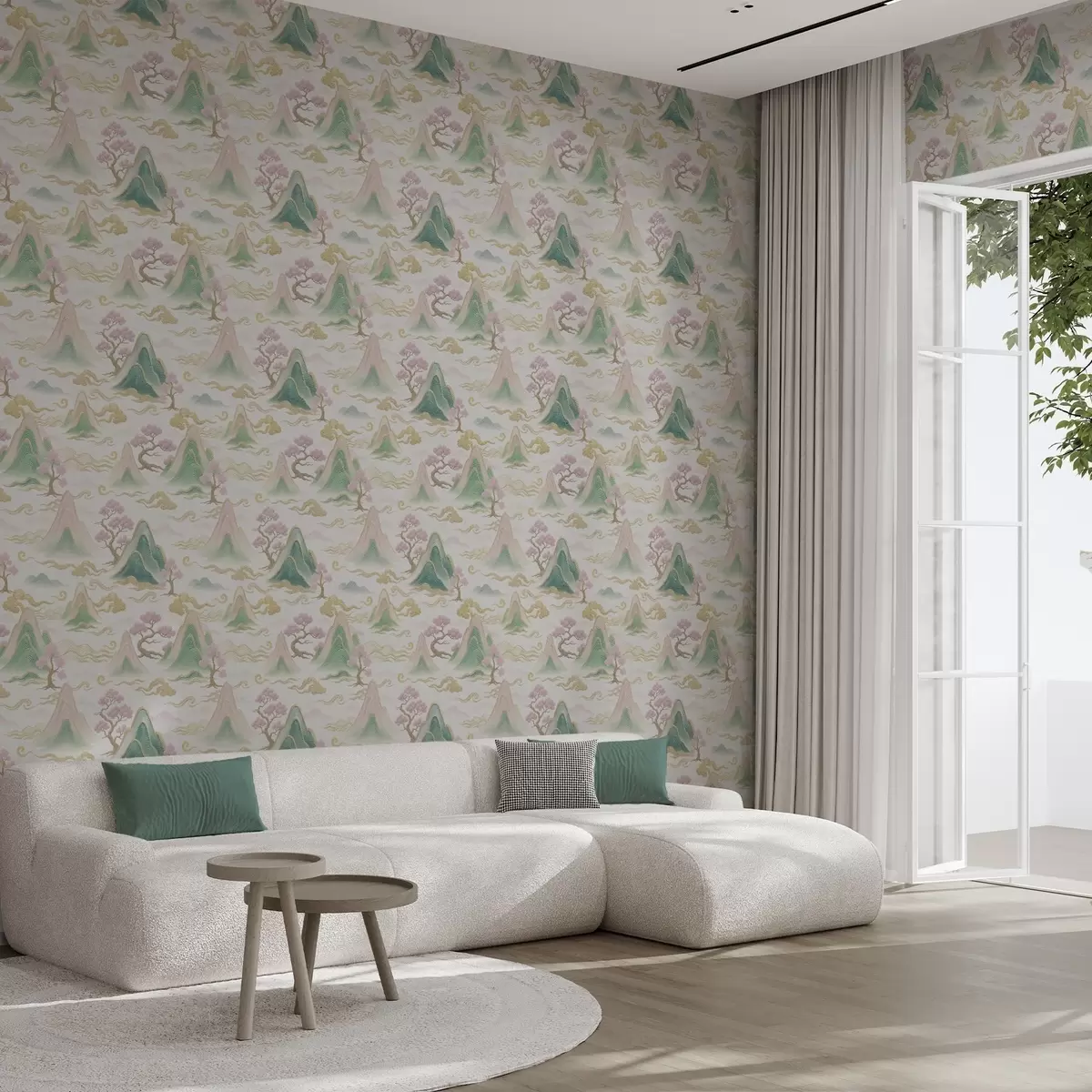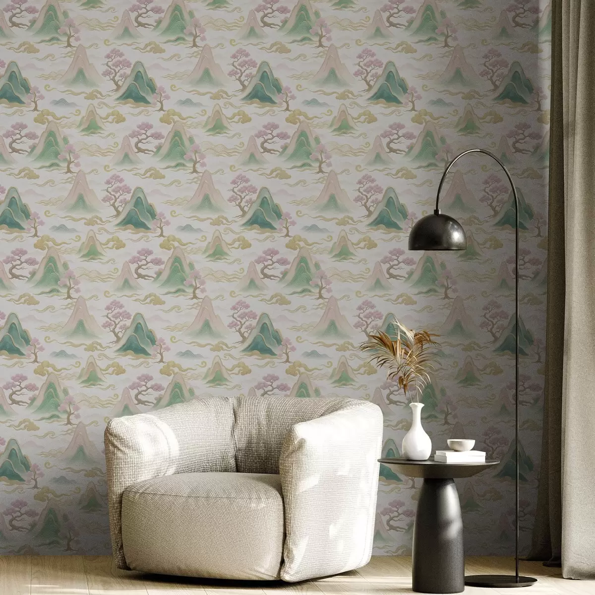 Tapet Munți, nori și pini într-un stil decorativ oriental Nr. a00703