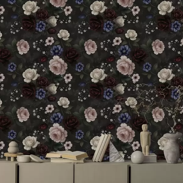 Tapet Trandafiri negri, anemone și bujori pe un fundal intens Nr. a00704