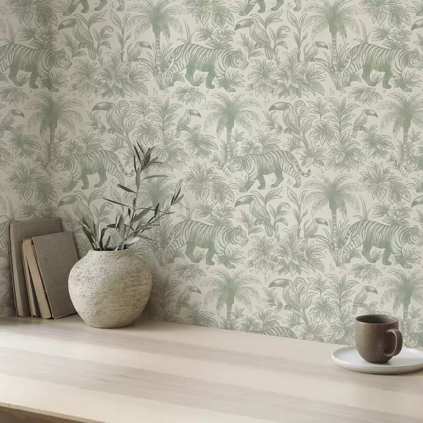 Tapet Tigri și păsări tropicale printre palmieri pe un fundal deschis Nr. a00711