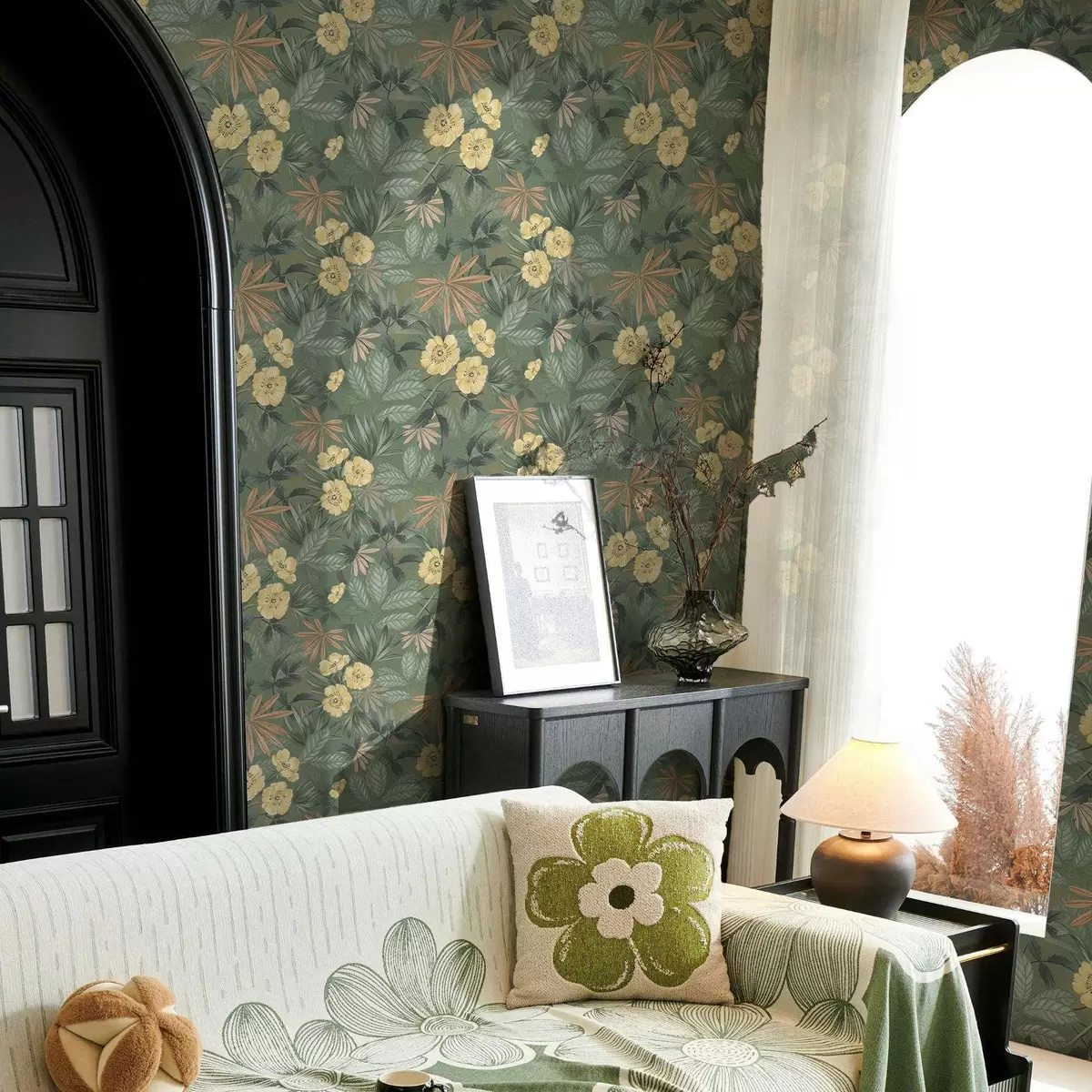 Wallpaper Flori galbene în mijlocul texturii frunzelor verzi a00718