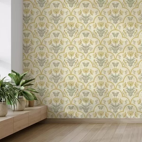 Tapet Ornament cu lalea, păsări și fluturi, ocru Nr. a00722