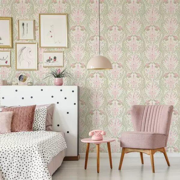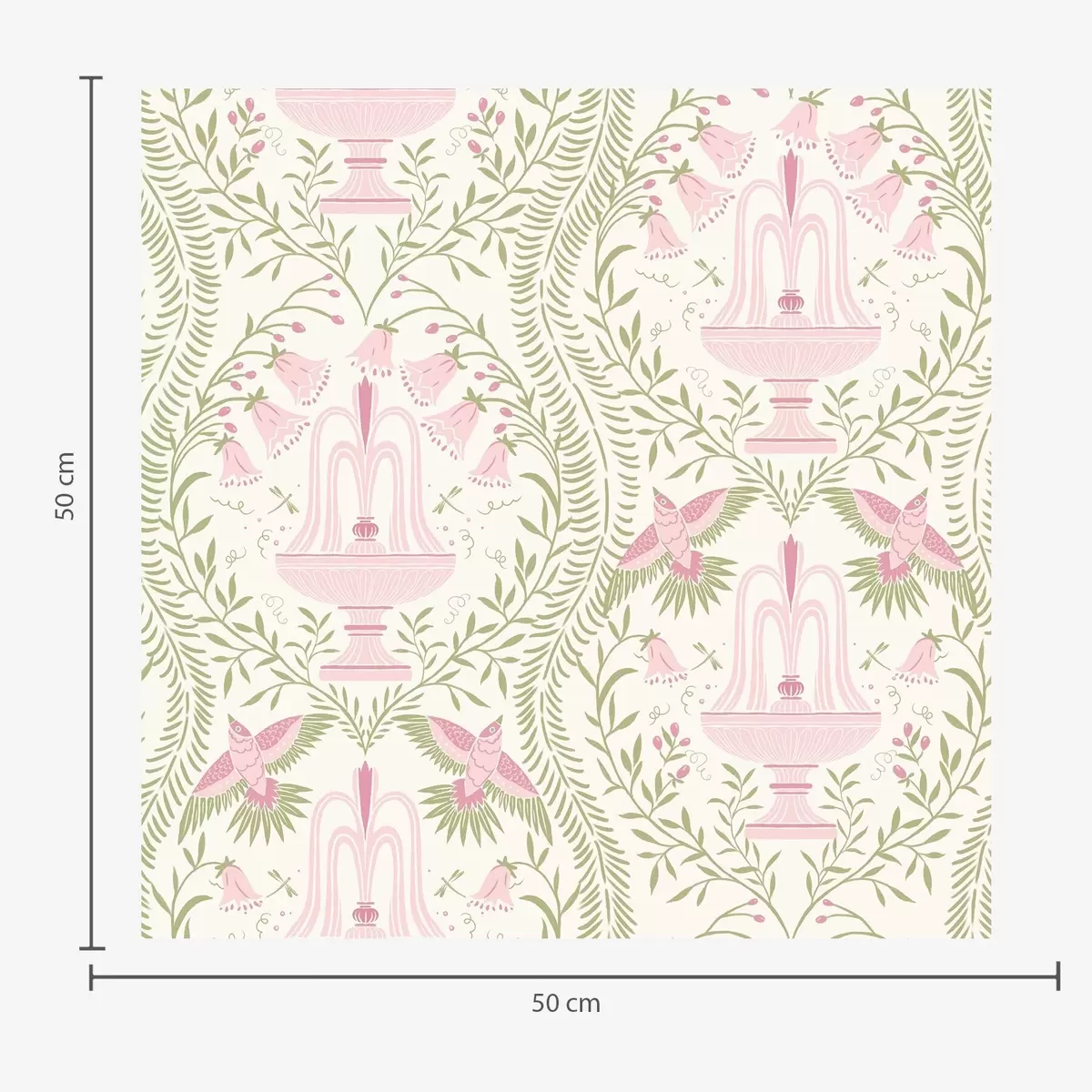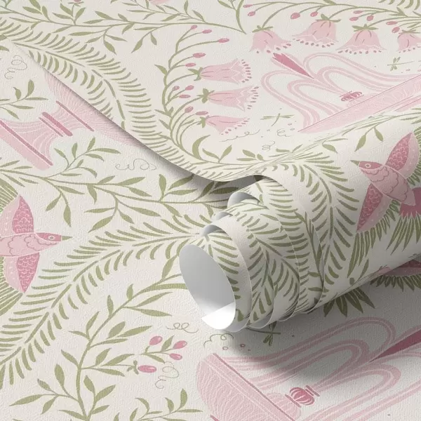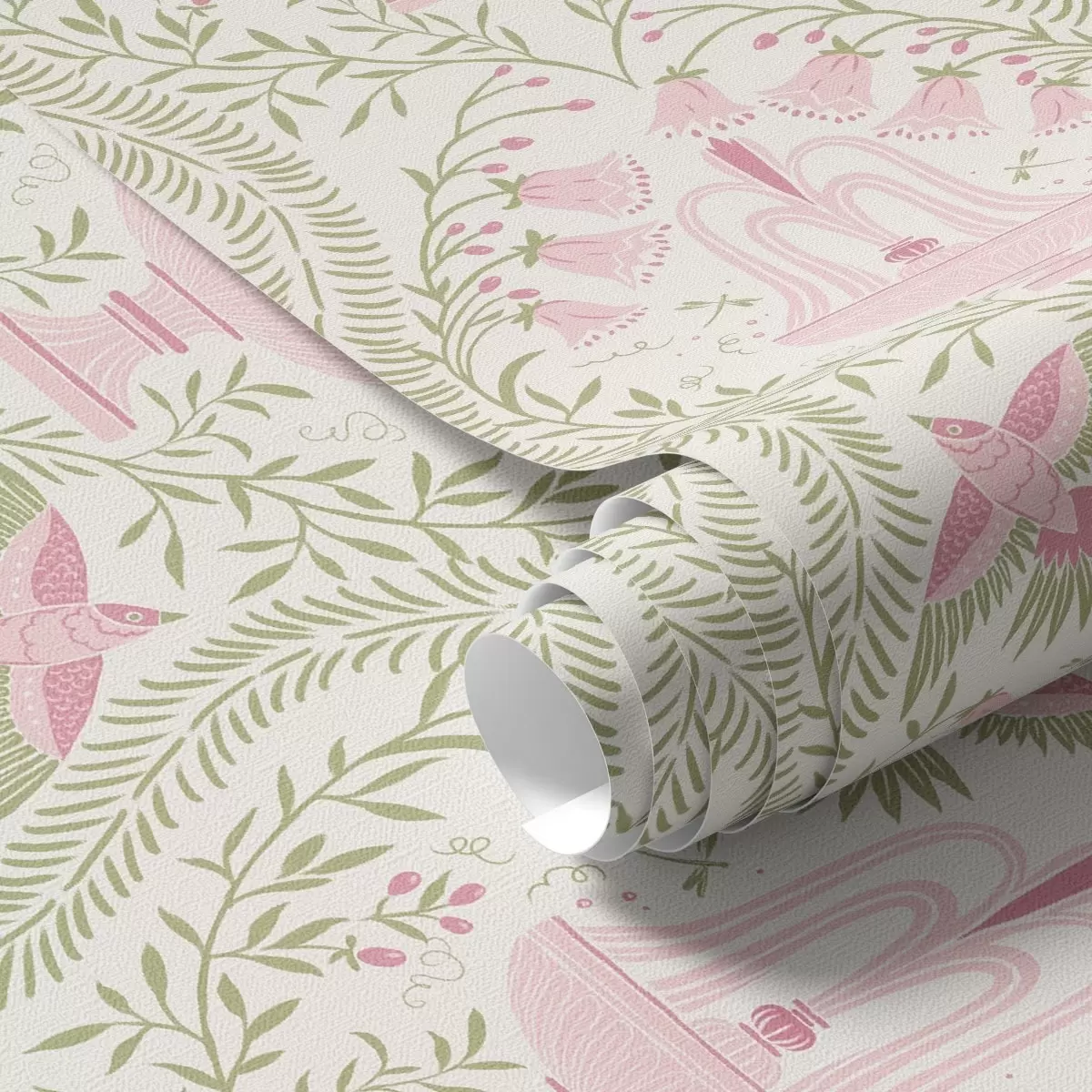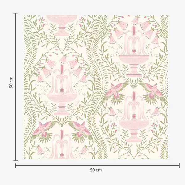 Tapet Fântâni, colibri și volute verzi pe un fundal deschis Nr. a00723