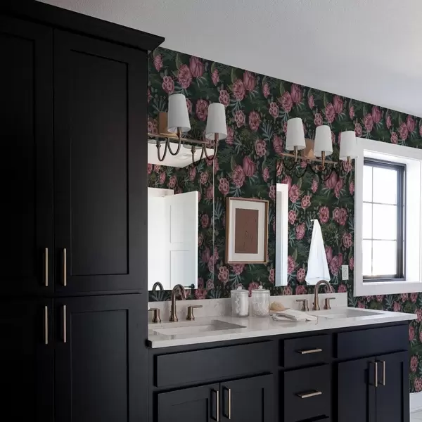Wallpaper Floră întunecată cu flori și frunze roz, fundal intens a00724