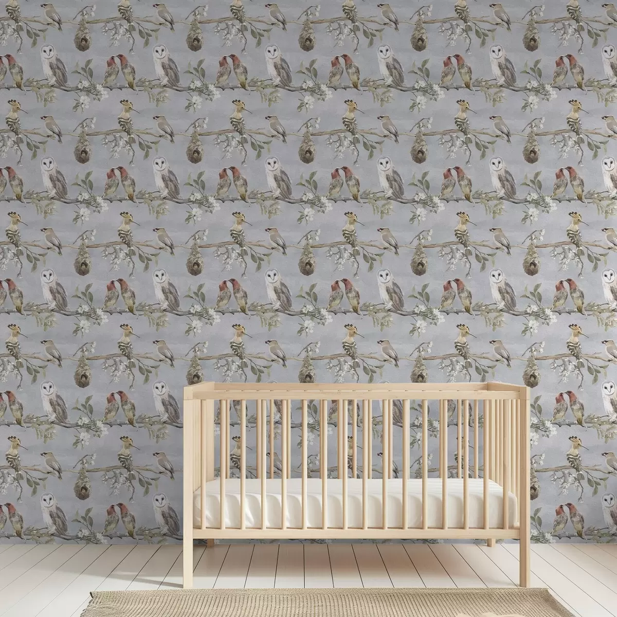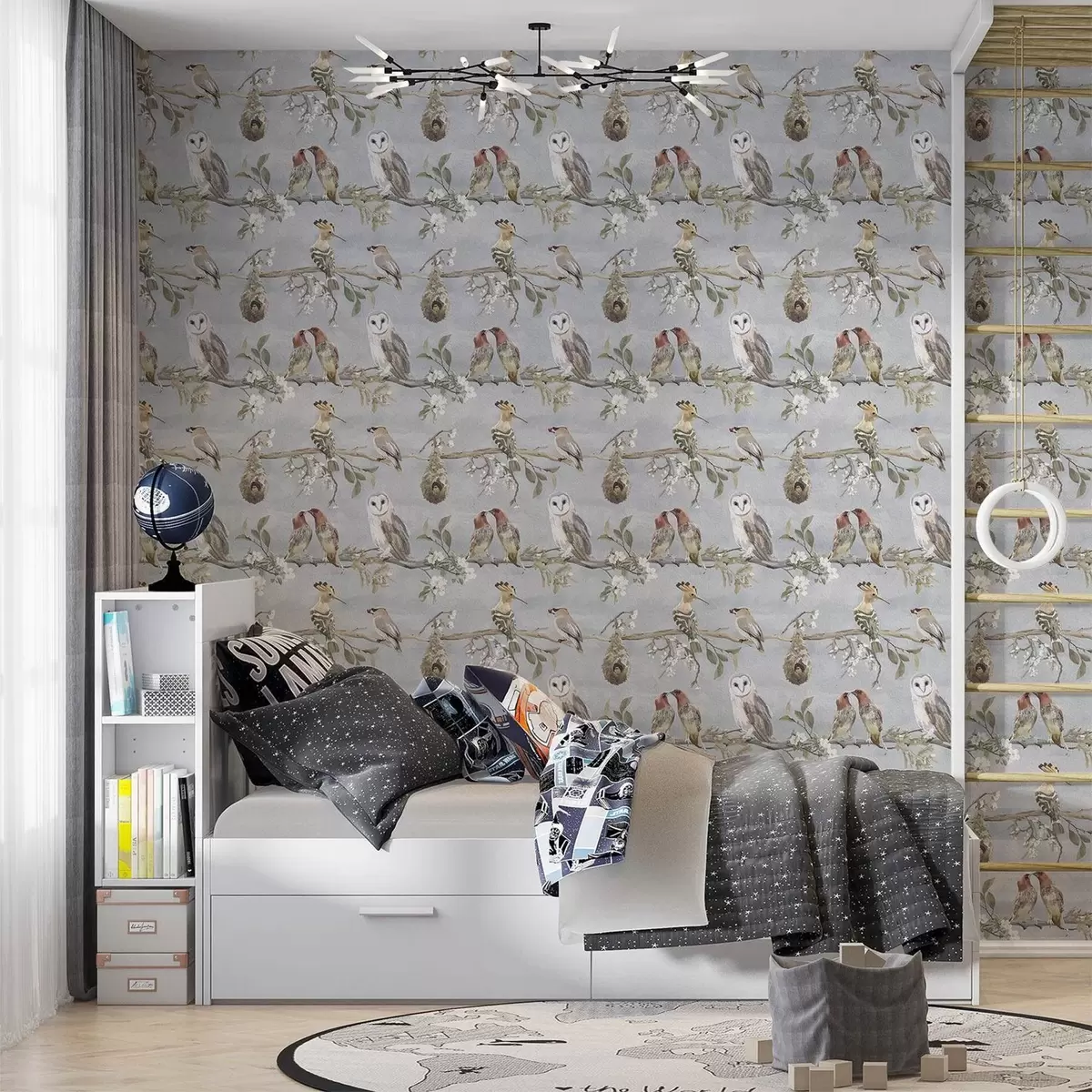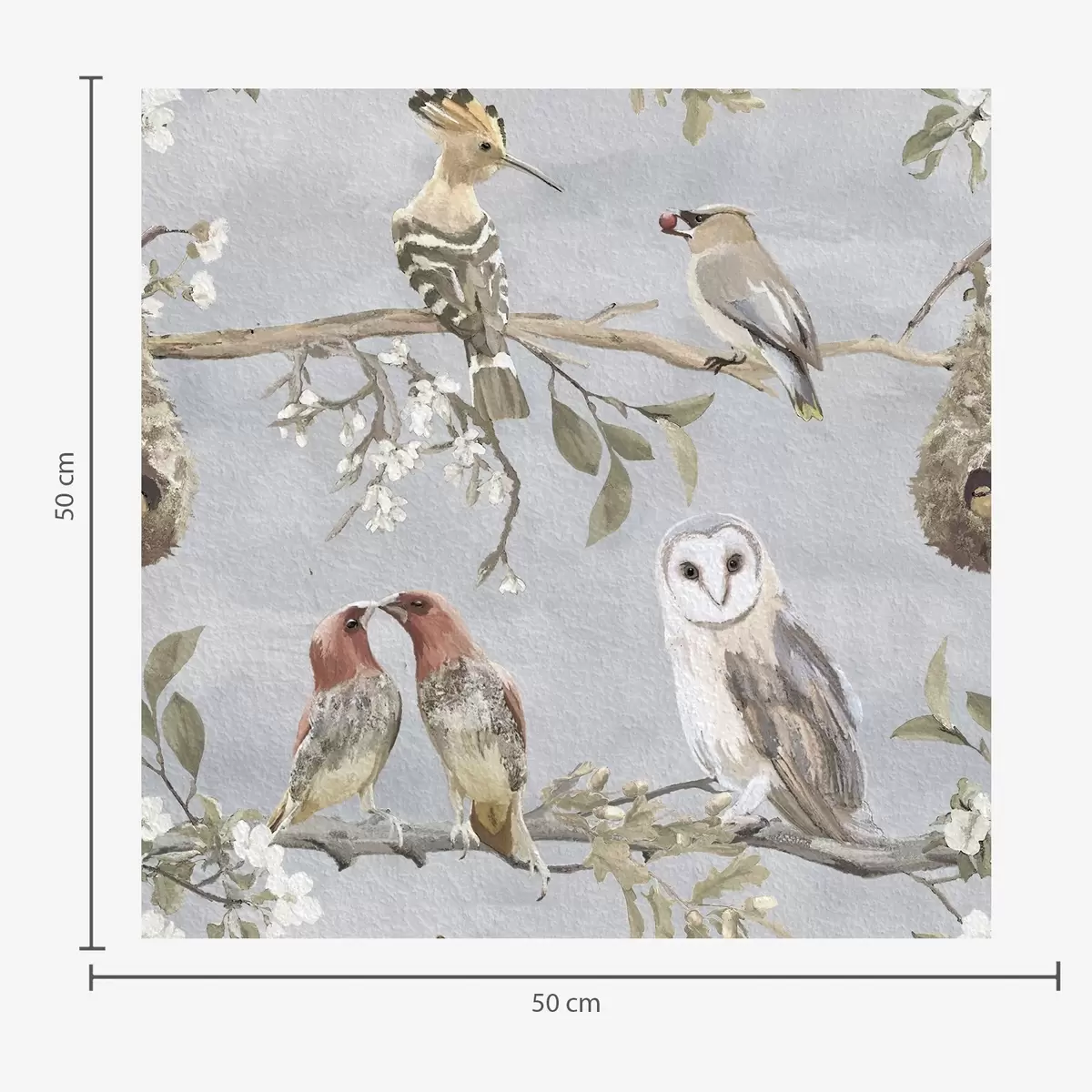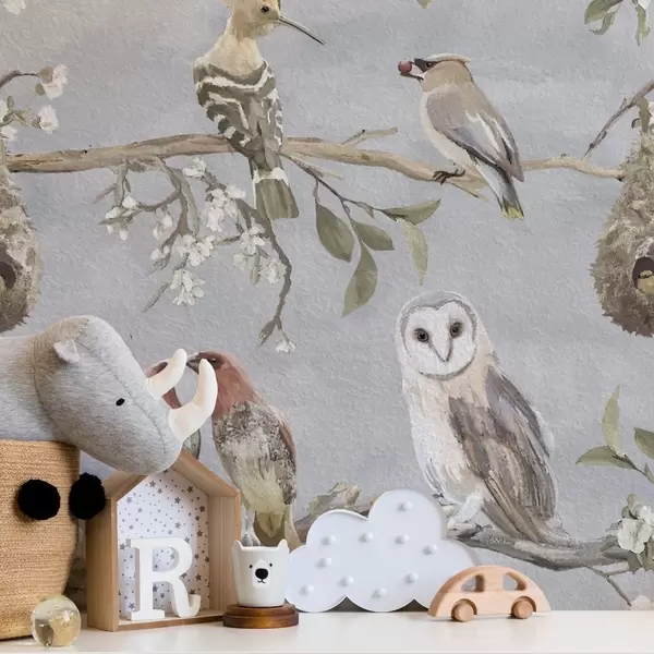 Tapet Păsări pe ramuri cu flori pe fundal gri Nr. a00738