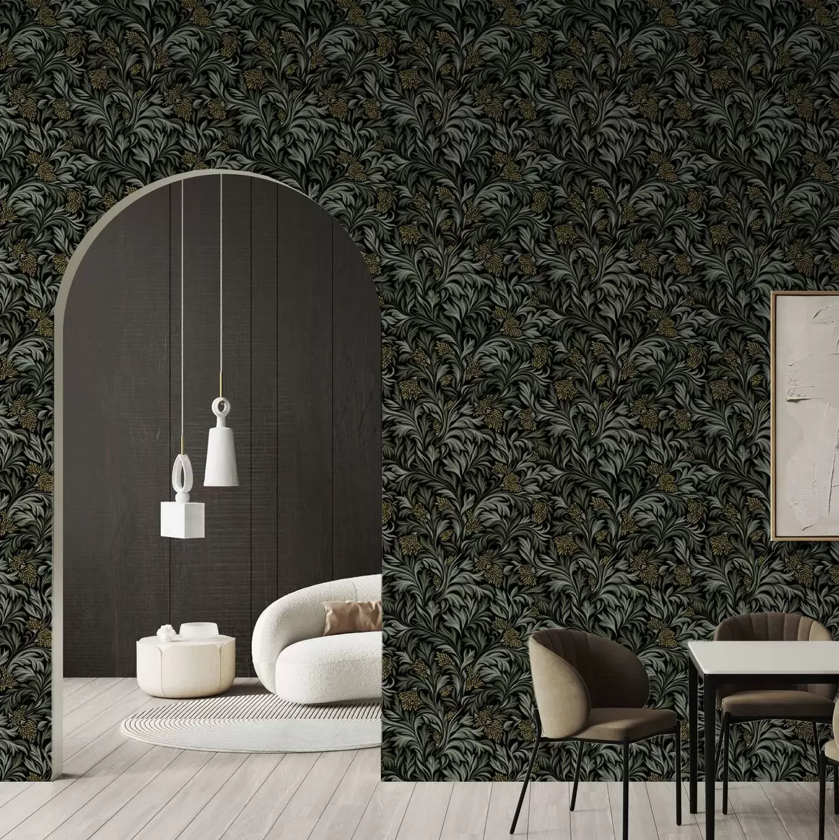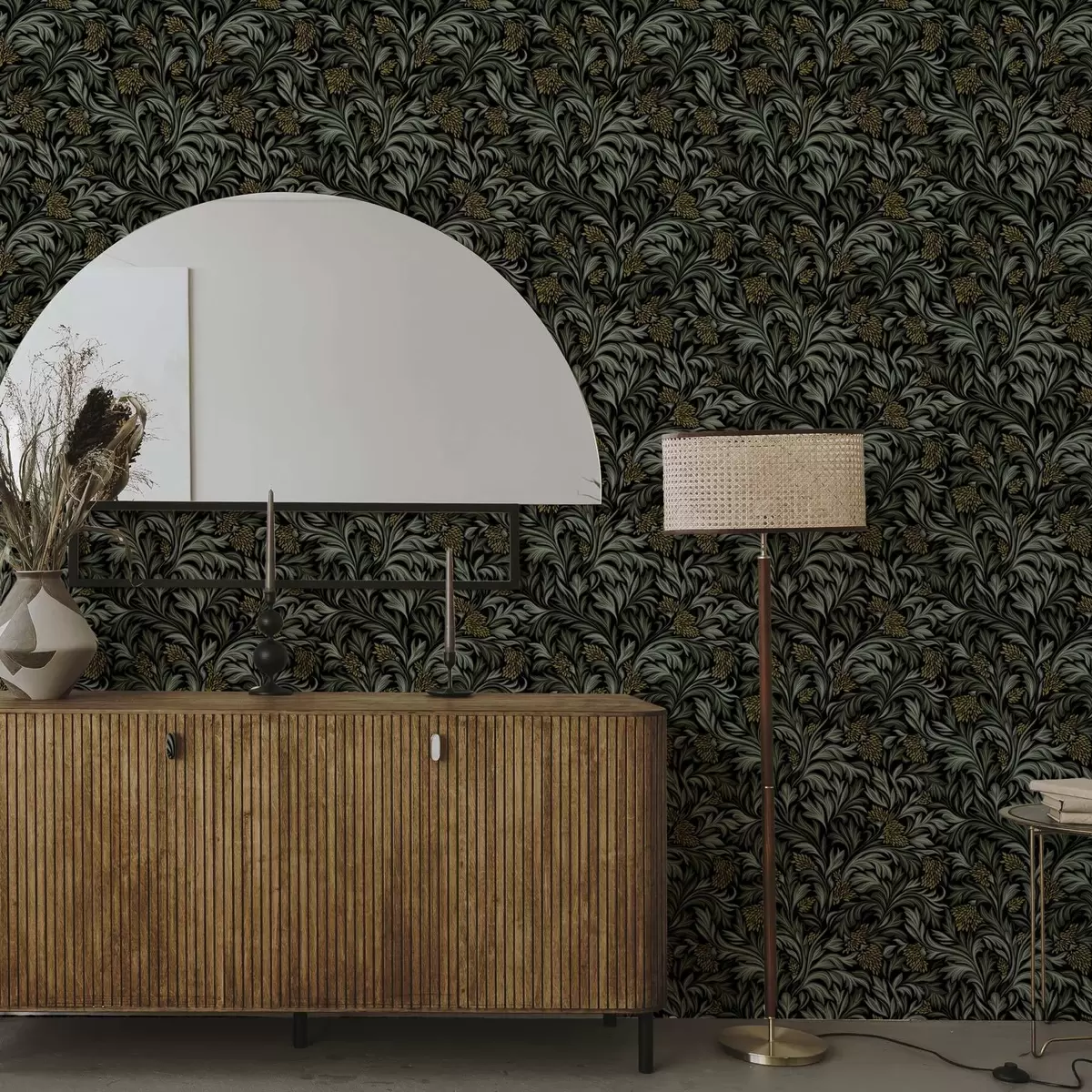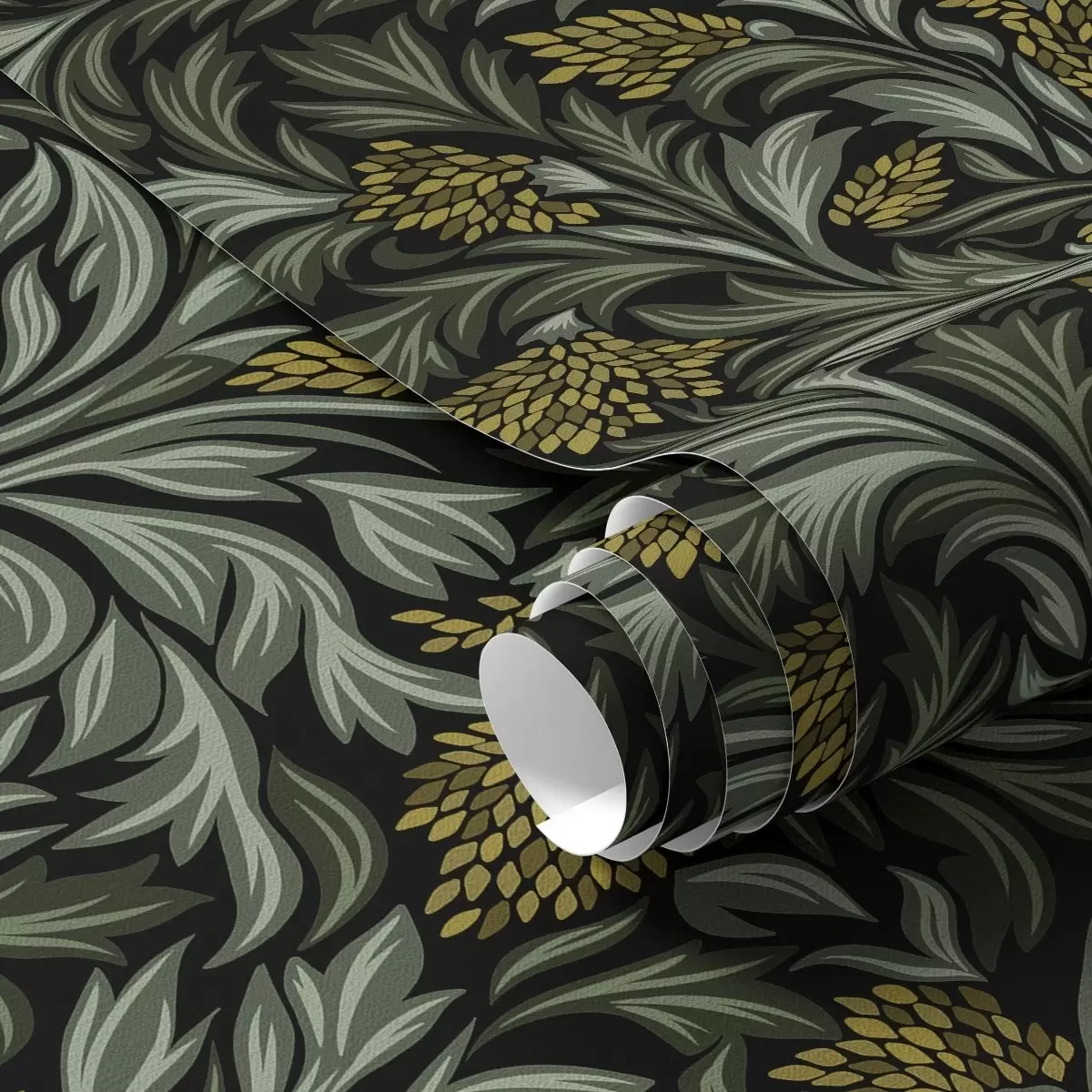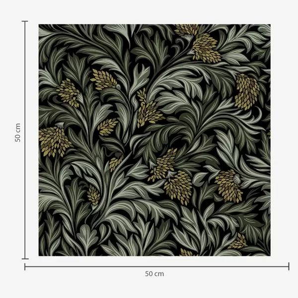 Tapet Frunze de acant negre cu conuri galbene pe fond negru Nr. a00745