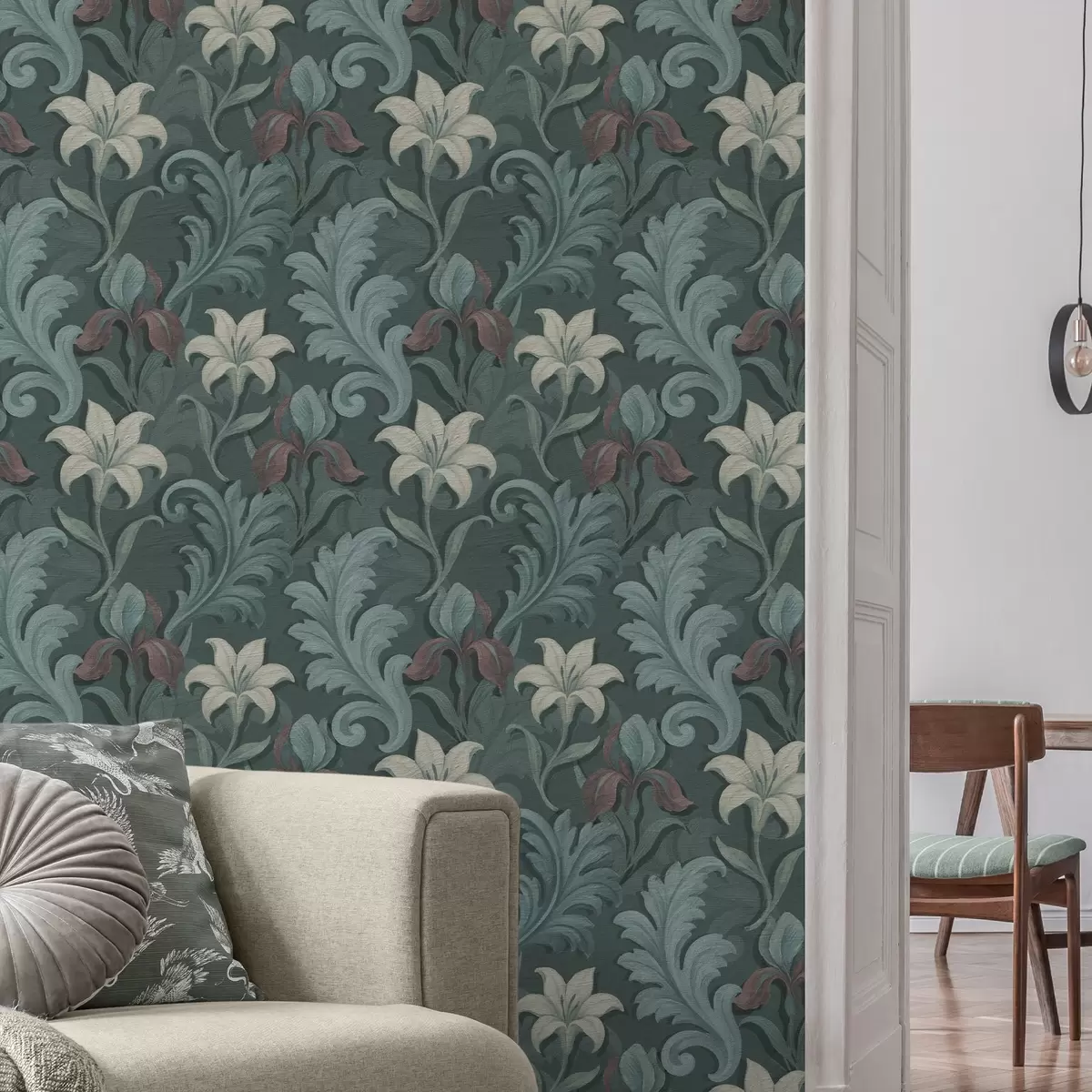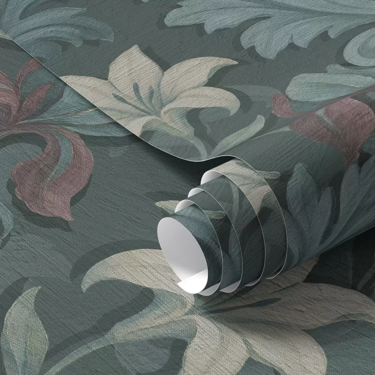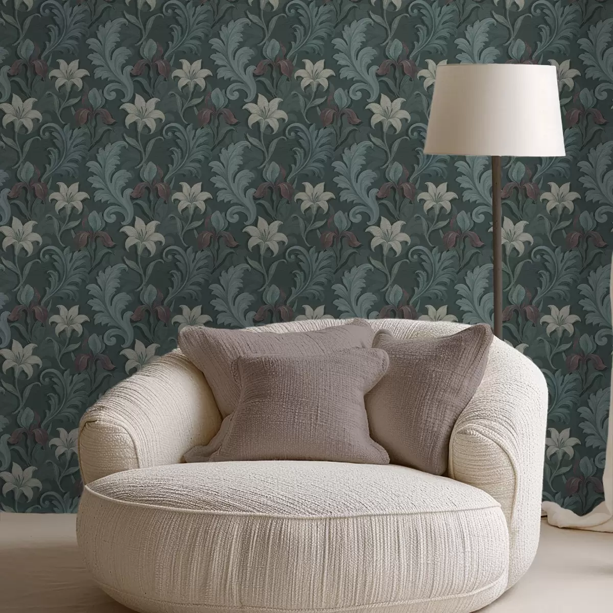Tapet Fundal verde închis cu iriși și frunze decorative Nr. a00755
