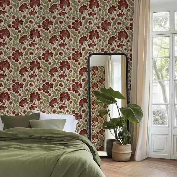 Tapet Flori burgund cu frunze verzi pe fundal deschis Nr. a00761