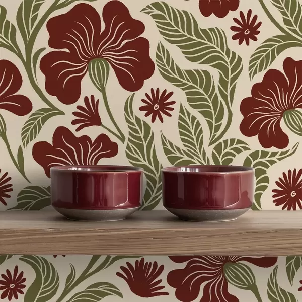 Tapet Flori burgund cu frunze verzi pe fundal deschis Nr. a00761