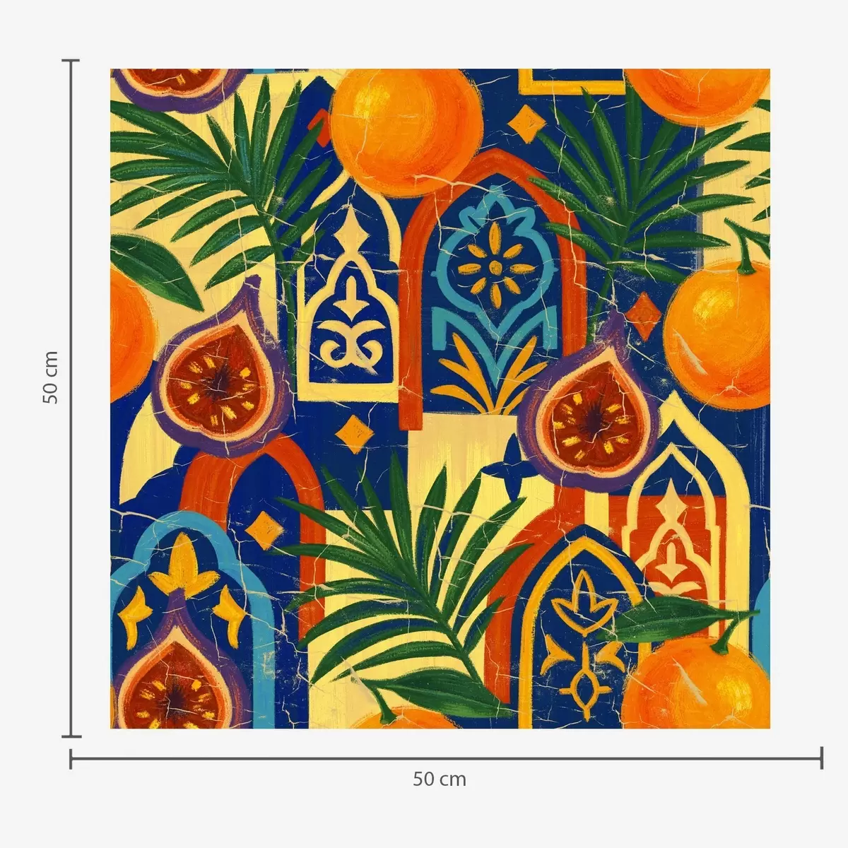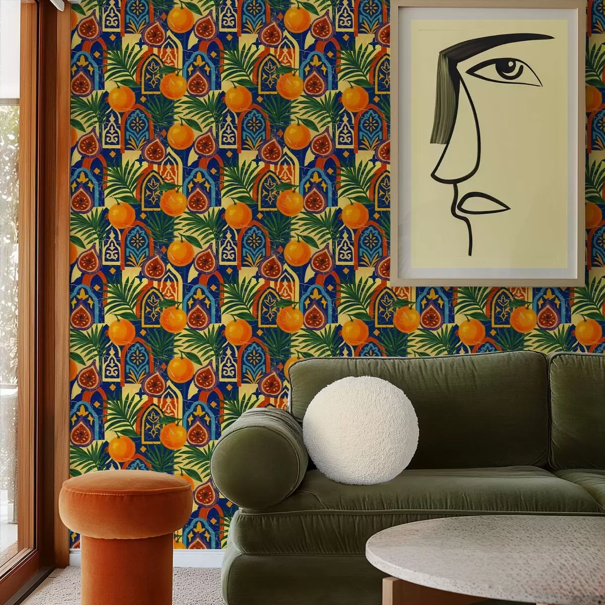 Tapet Portocale strălucitoare, frunze de palmier și arcade marocane Nr. a00767